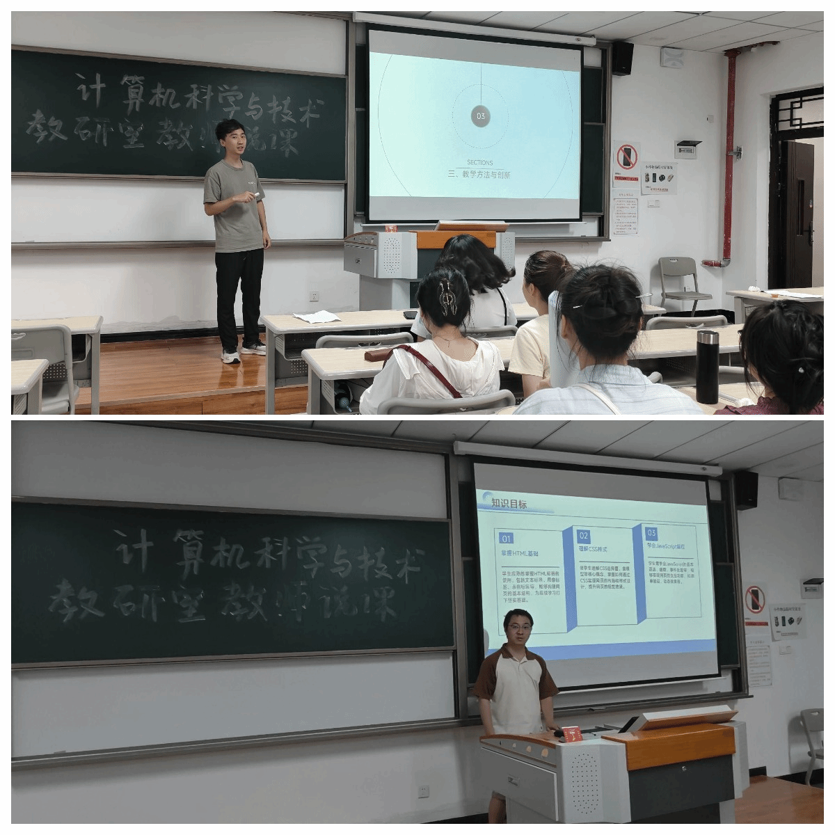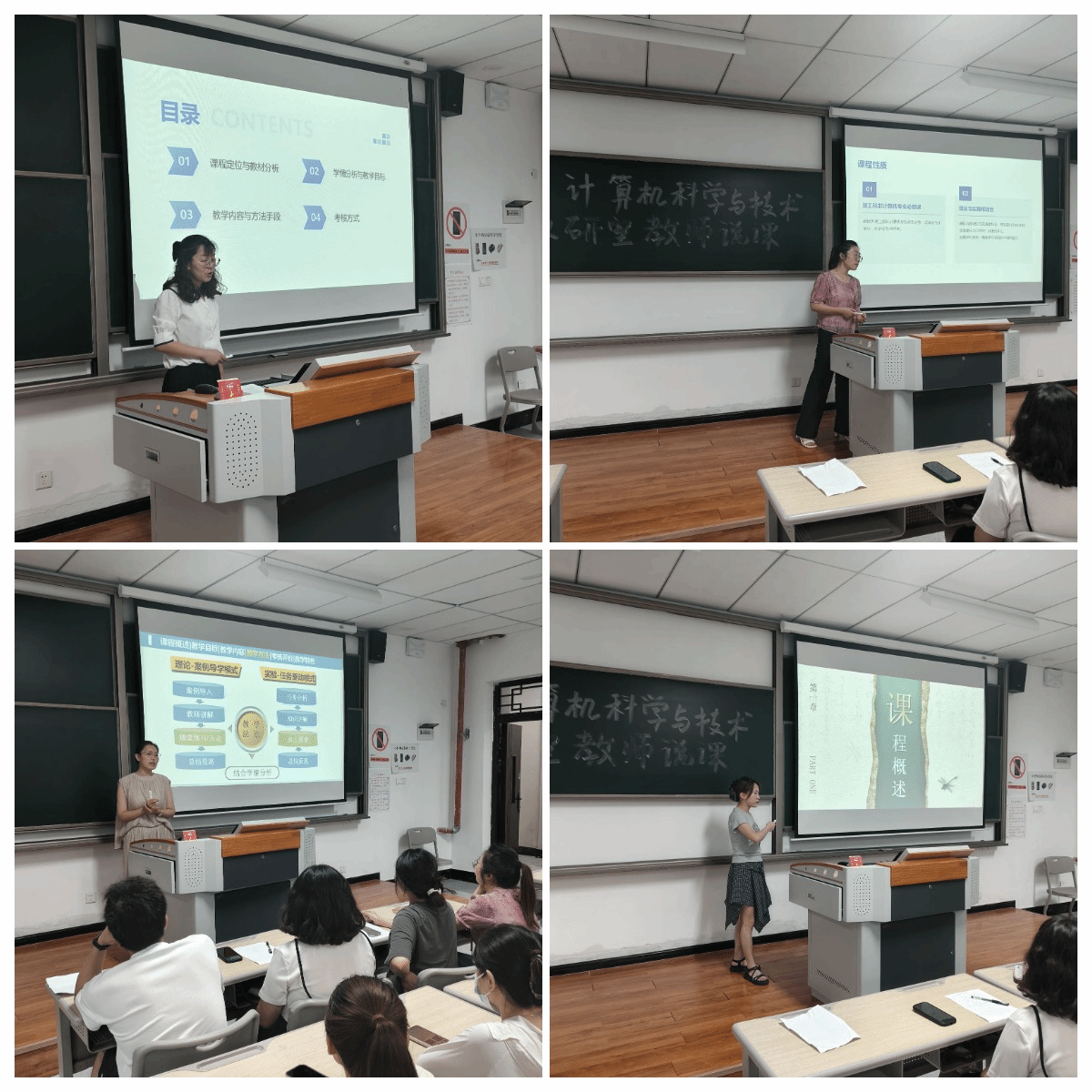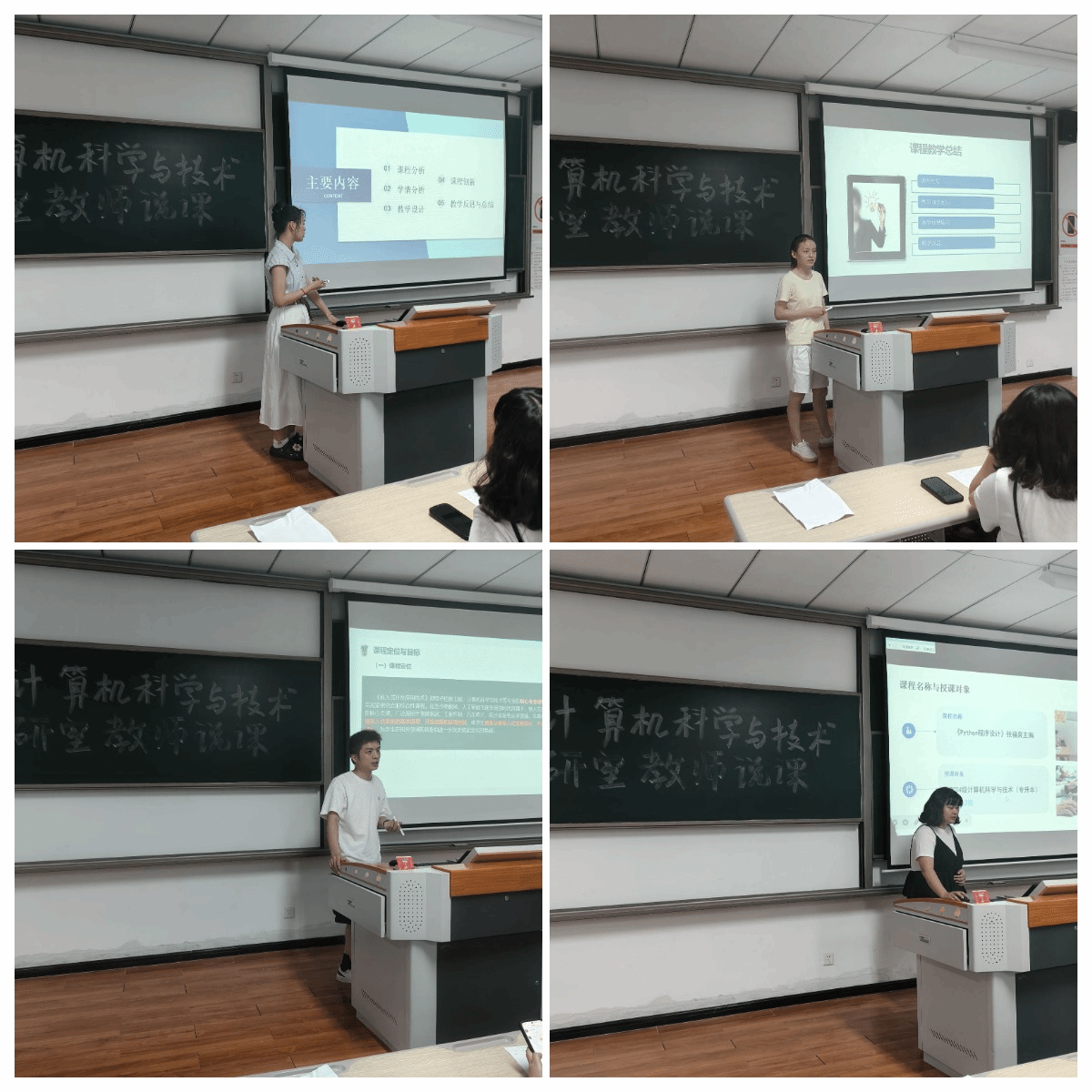 说课环节成为教师们展示教学智慧与专业功底的舞台。近十位教师依次登台,围绕所授核心课程,从“为何教”、“教什么”、“如何教”及“效果如何”四大维度展开深度剖析。