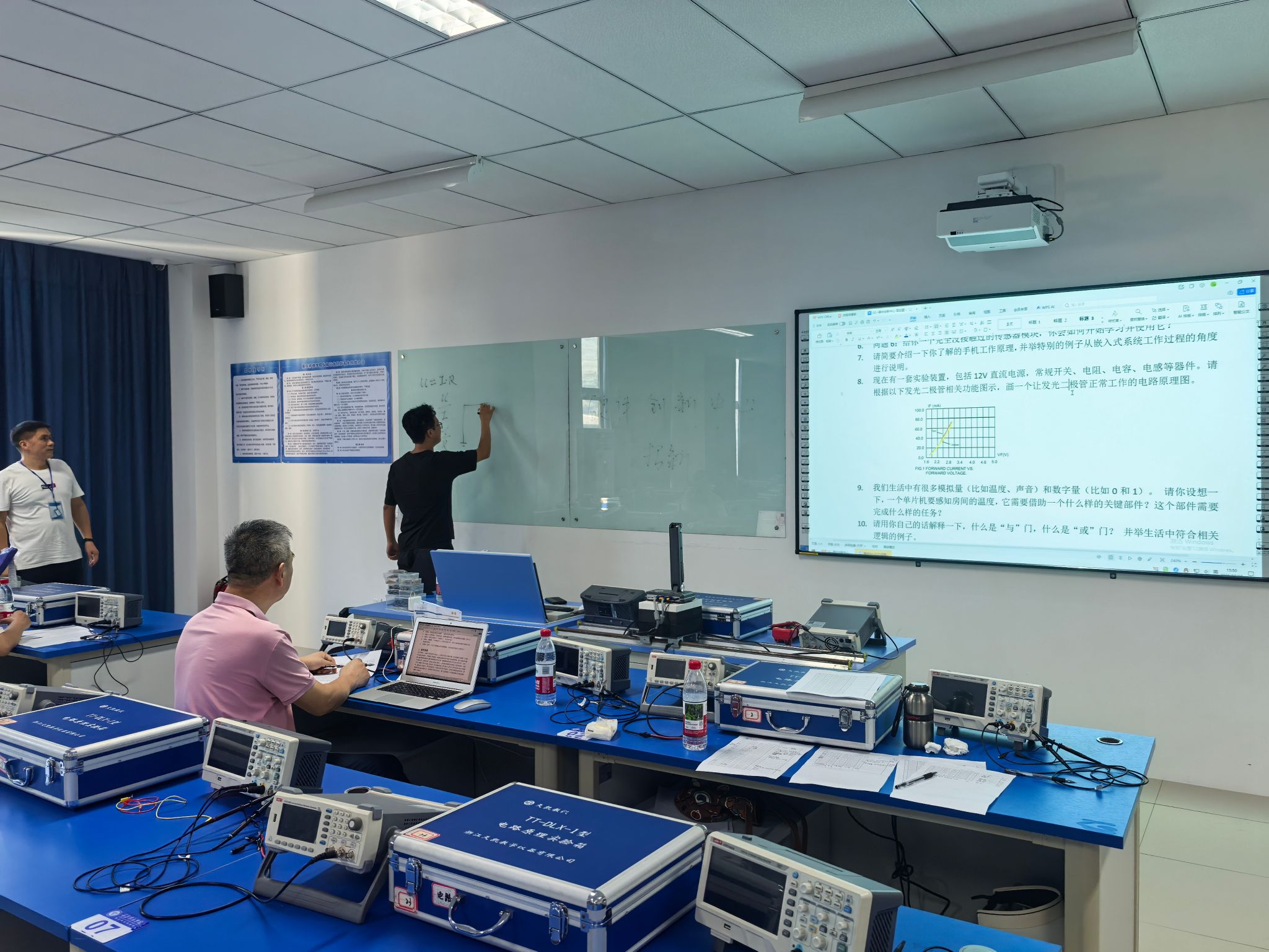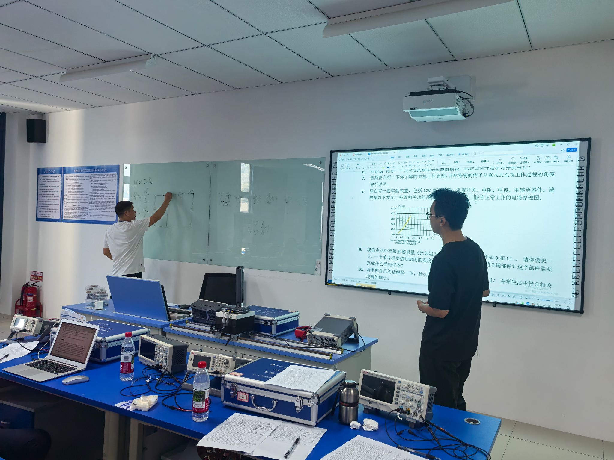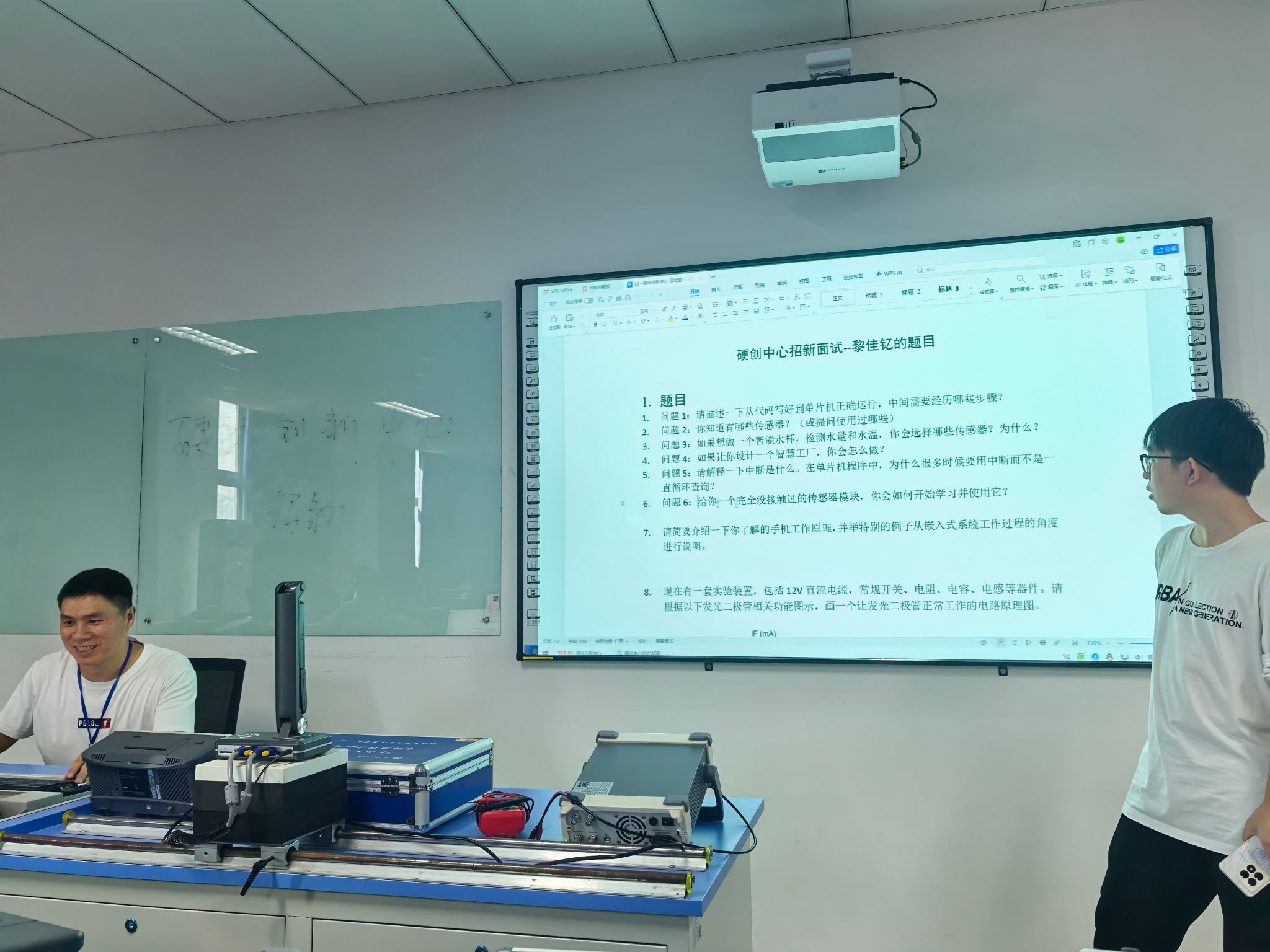面试环节设计科学,全面考察学生的综合素质。在专业能力评估部分,众多面试者表现出色,从容应对评委提问,展现了良好的专业素养和发展潜能。尤为值得一提的是,在实践动手能力测试中,设置了手绘二极管正常工作电路图的面试题目。部分同学在尝试中出现了细节上的瑕疵,但在周绪林老师耐心且专业的现场指导下,得以即时发现问题所在并完成修正。这一互动过程,生动体现了硬创中心“理论与实践深度融合”的教育理念,以及注重启发、教学相长的良好氛围。