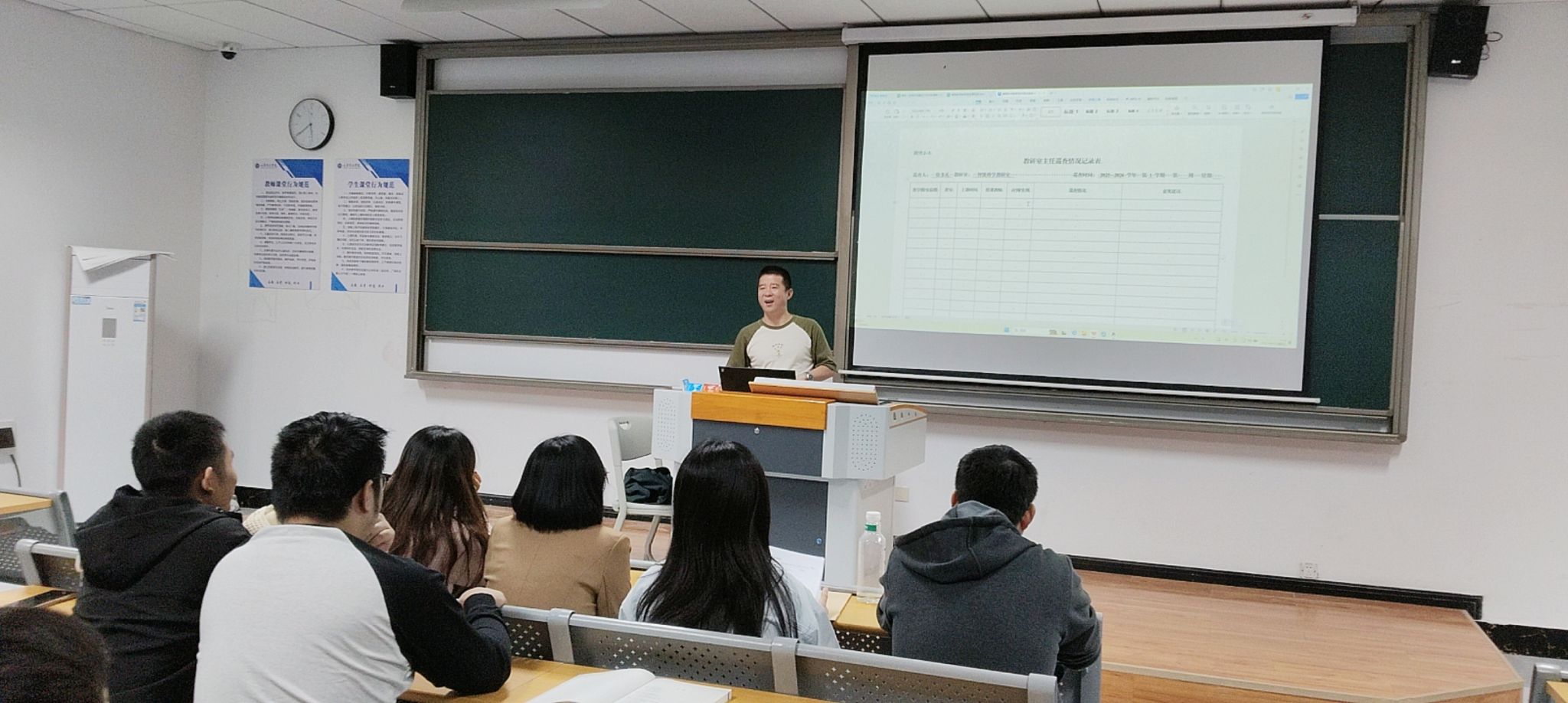 2025年10月22日晚,勇者楼教室灯火通明,计算机学院智能科技教研室在此召开了一场至关重要的例会。本次例会由教研室主任徐多礼主任主持,旨在全面部署学校布置的评估工作,并深入探讨如何高质量完成各项任务。教室里,投影仪将关键信息清晰地投射在屏幕上,徐多礼主任站在讲台上娓娓道来,其他老师则坐在台下专注聆听、积极思考。
