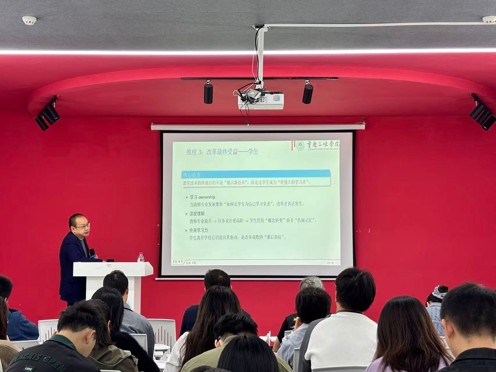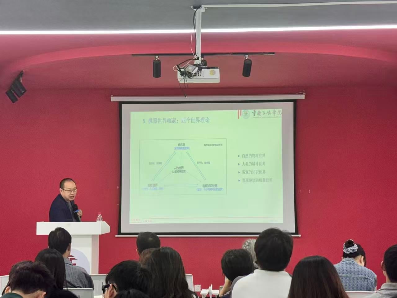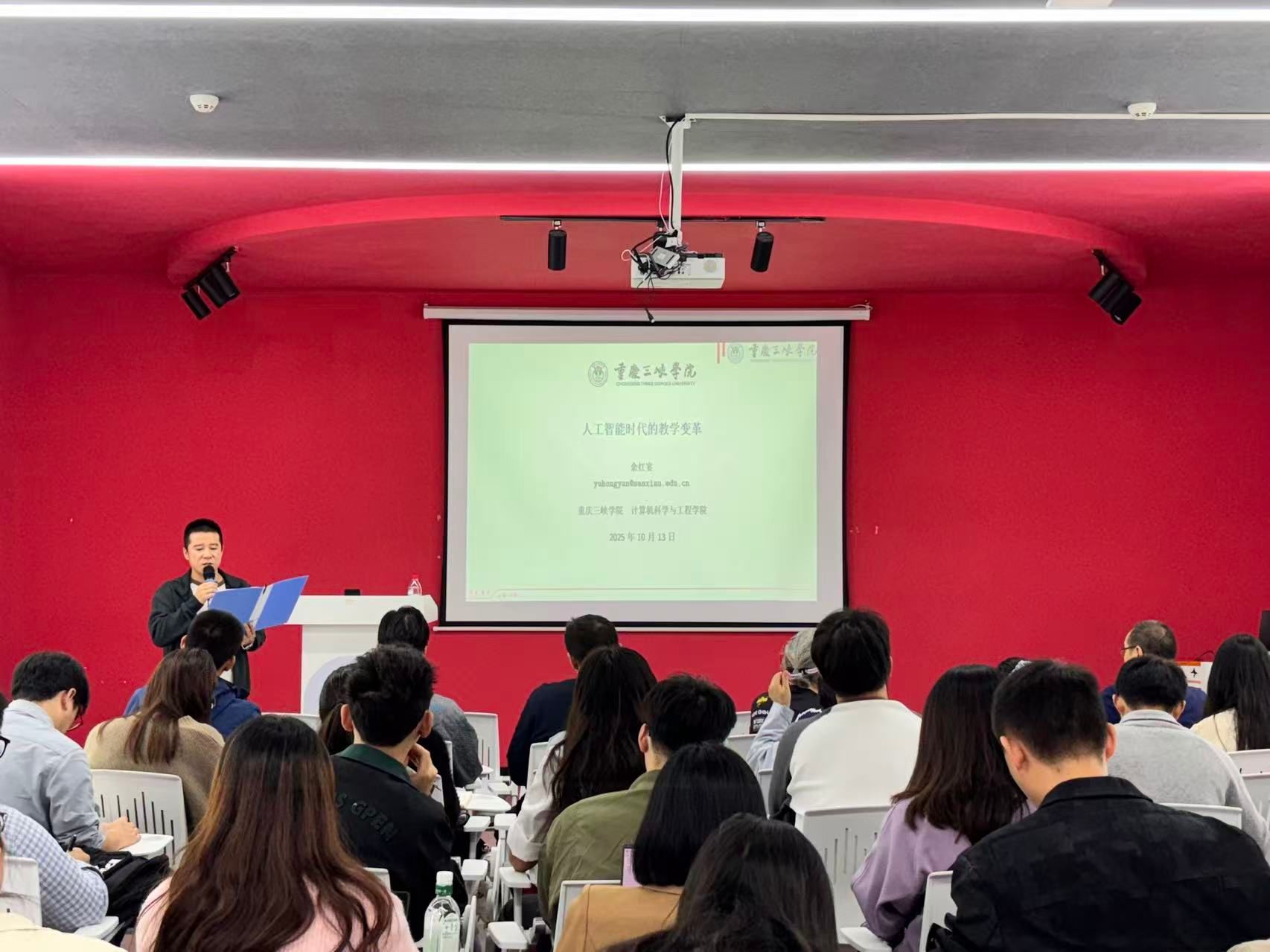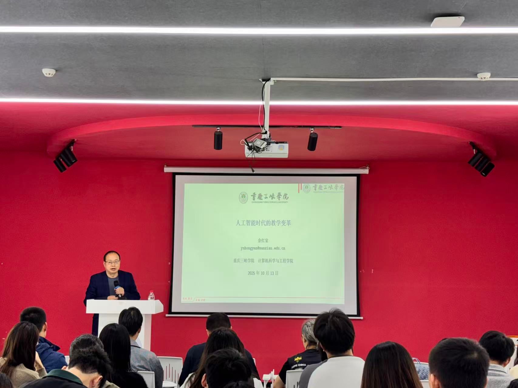 为主动应对人工智能技术发展对教育领域带来的深刻变革,全面提升教师教学素养与育人能力,2025年10月22日,计算机学院特邀重庆三峡学院余红宴博士莅临我院,在玉棠书院-TalkKing演讲厅为全体教职工带来了一场题为“人工智能时代的教育教学变革”的专题讲座。本次活动由徐多礼主任主持,计算机学院全体任课教师及辅导员共同参与。