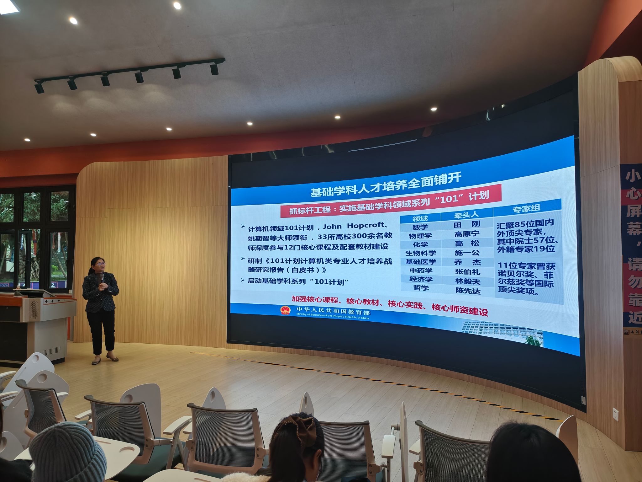 牛彦敏副教授的讲座高屋建瓴,内容翔实,逻辑清晰。她首先从国家战略与教育发展的高度切入,回顾了我国一流课程建设的“双万计划”以及近年来在基础学科领域全面铺开的“101计划”。她特别展示了相关资料图片,指出:“从计算机领域的‘101计划’由约翰·霍普克罗夫特、姚期智等大师领衔,到数学、物理学等领域汇聚国内外顶尖专家,其核心无不是聚焦于‘核心课程、核心教材、核心实践项目和核心师资队伍’的建设。这为我们指明了方向:课程是人才培养的‘主战场’,而‘金课’的建设必须要有标杆、有体系、有深度。”