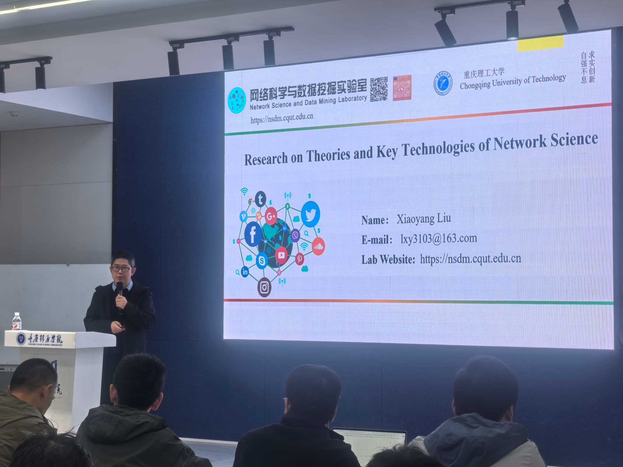 2025年10月31日下午2点,计算机学院在綦河书院-观涛-多功能报告厅成功举办了题为《Research on Theories and Key Technologies of Network Science》的学术讲座。本次讲座特邀重庆理工大学计算机学院刘小洋教授,参与对象包括计算机学院全体教职工,现场座无虚席,学术气氛热烈。