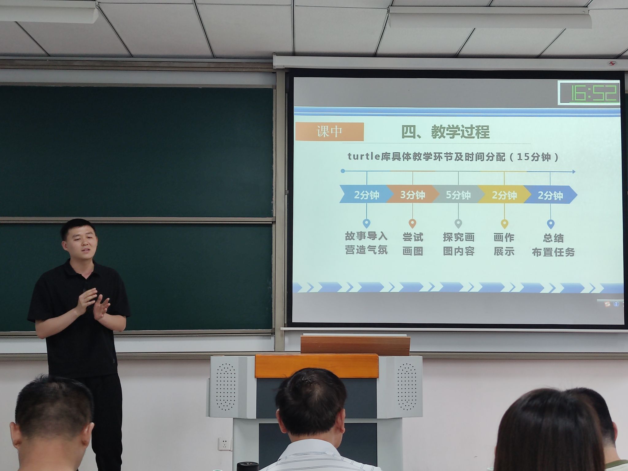磨课环节中,周海老师首先以《Python程序设计——turtle库》为题,通过“给你一朵小花花”的趣味案例导入课程,生动展示了turtle库的绘图功能。在授课过程中,周老师巧妙结合代码讲解与视频演示,直观呈现了如何绘制叶子、添加颜色等操作,将抽象的编程知识形象化呈现。
