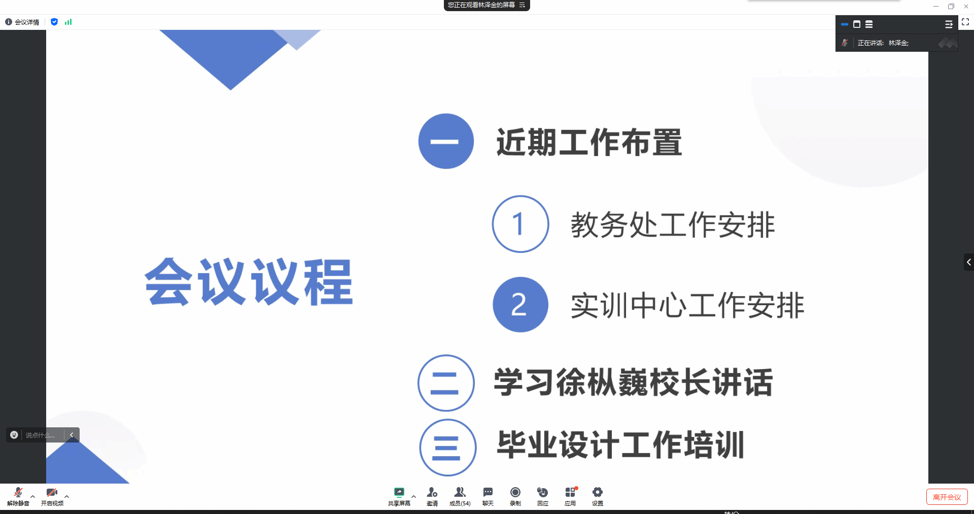 2024 年 9 月 11日,在这个阳光明媚的日子里,为保证新学期学院工作的正常推进,计算机学院围绕近期工作任务布置以及毕业设计指导工作召开了线上的开学工作会议。本次会议由林泽金副院长主持,计算机学院全体教职员工参加。