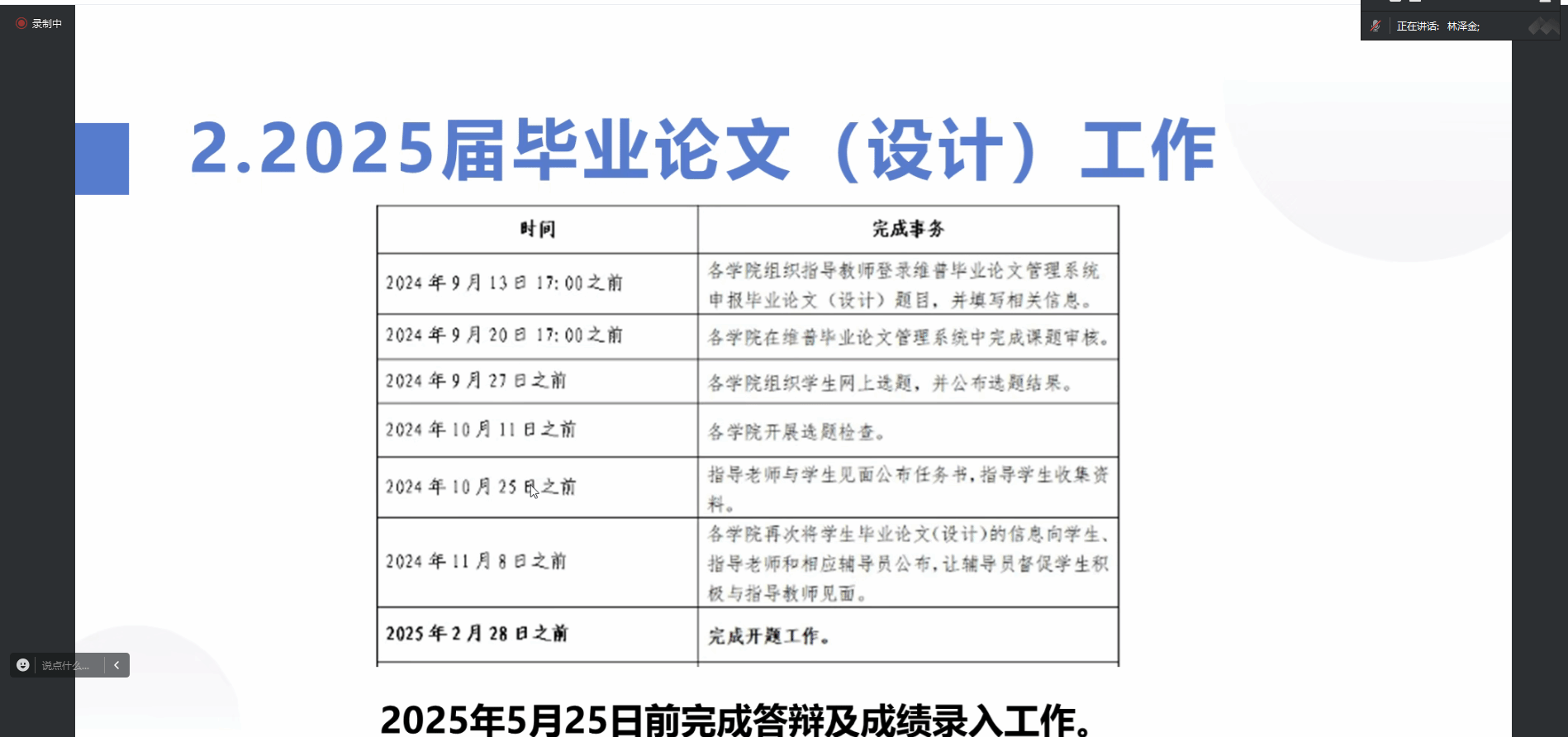 会上,林院长进行了精彩的宣讲工作,并对近期教学工作任务做出安排。首先,林院长针对学院近期工作做出了一一部署。近期主要工作包含2024 级本科以及专升本人才培养方案的撰写、学院缓补考、毕业论文抽检、2025届毕业生实习、教改项目结题、新生体验课、一流课程和课程思政申报、2024 级入学资格复查、学籍信息核对、学生流降级等。同时,林院长强调2025届毕业论文指导尤为重要,督促各指导老师,及时与学生沟通,保障论文指导工作有序推进。
