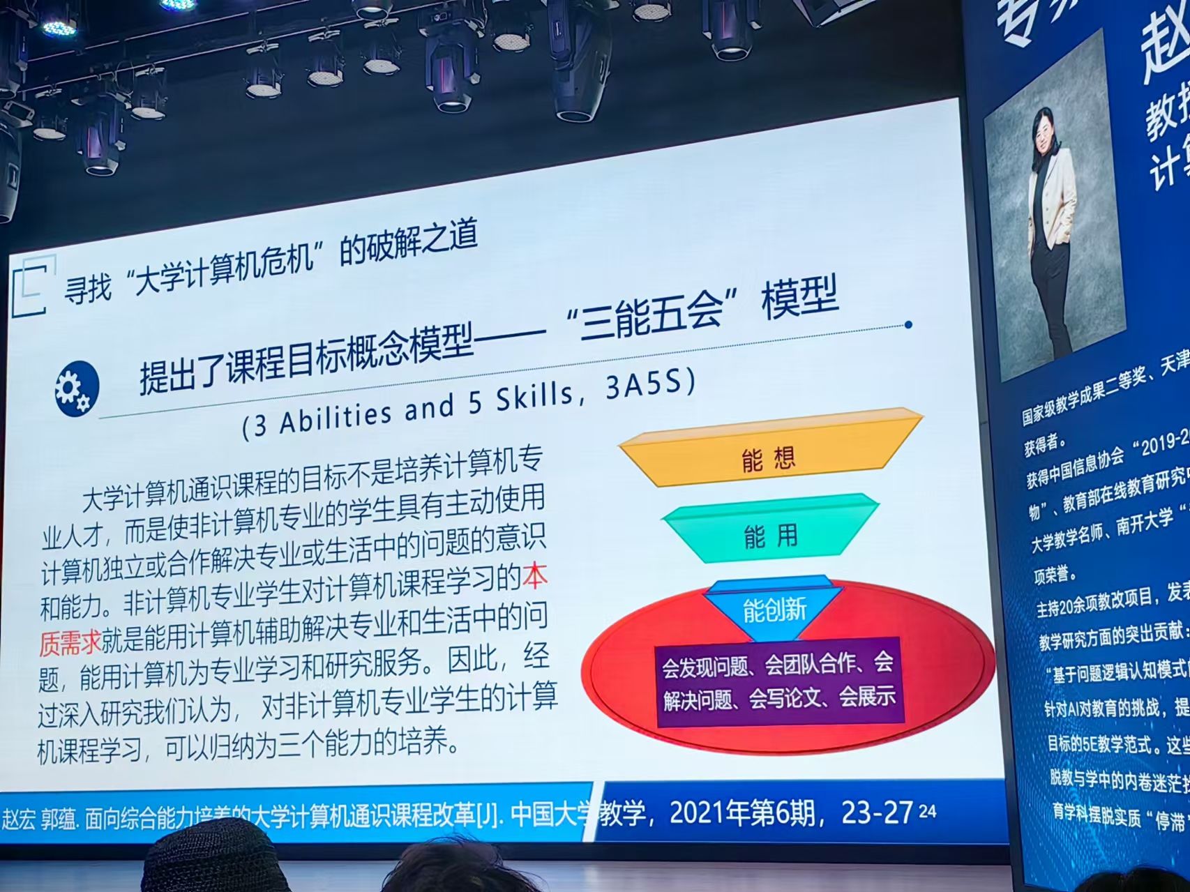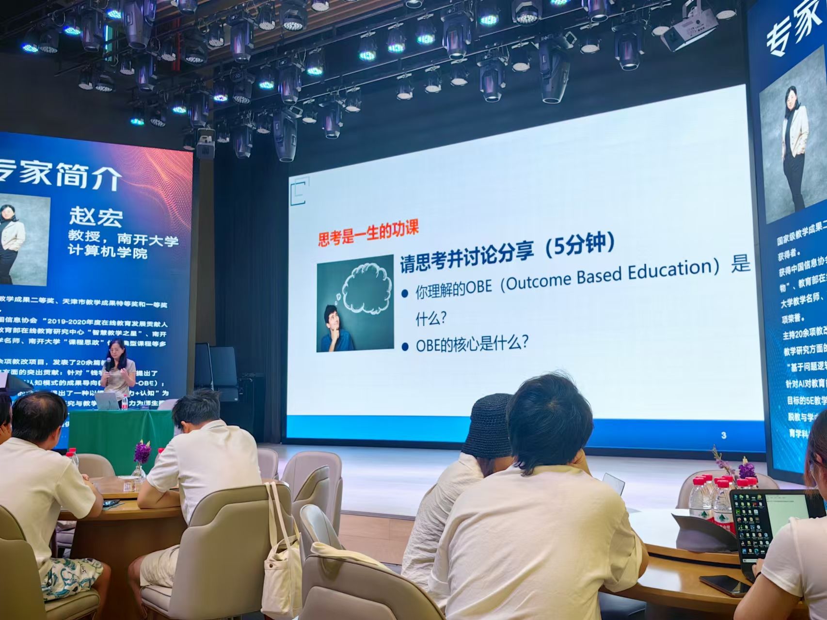 南开大学计算机学院赵宏教授给大家分享了《基于POT-OBE的教学目标 课程设计及实践效果评价》的经验交流,针对“钱学森之问”提出了“基于问题逻辑认知模式的成果导向教育(POT-OBE);针对AI对教育的挑战,提出了一种以提升“能力+认知”为目标的5E教学范式。这些研究与教学实践,努力为师生摆脱教与学中的内卷迷茫找到一个突破口,为AI冲击下的教育学科摆脱实质“停滞”提供一个思路。首先,赵宏教授对建课背景、联盟背景进行了介绍,并作题为“基于问题逻辑认知模式的成果导向教育POT-OBE”的报告。她首先分享了关于未来教育的三点思考——智能化时代教育的特征、教师和学生角色如何定位、教师能让学生带走什么,激发了与会教师的共同思考。随后,她分享了POT-OBE(基于问题逻辑认知模式的成果导向教育)理念,并结合教学实践案例介绍了一种以提升认知为目标的5E教学范式(Excitation、Exploration、Enhancement、Execution、Evaluation)。最后,她以“认知觉醒、思维升级、自觉POT-OBE、拥抱AI”的联盟文化激励与会教师,鼓励大家面对挑战积极应对,共同探讨、及时分享。从“为什么优秀人才难培养”到“希望自己的课程让学生带走什么”,赵老师循循善诱,通过提问引导在场老师反思自己在教学过程中现存的问题,并通过“基于问题逻辑认知模式的成果导向教育(POT-OBE)”理念,展示了高效提升课堂教学效果及教学质量的教学方案设计思路、教学路径与评价方法,以及教学成果凝练总结的方法等,帮助老师们建构起对于 OBE 理念的系统性认知。