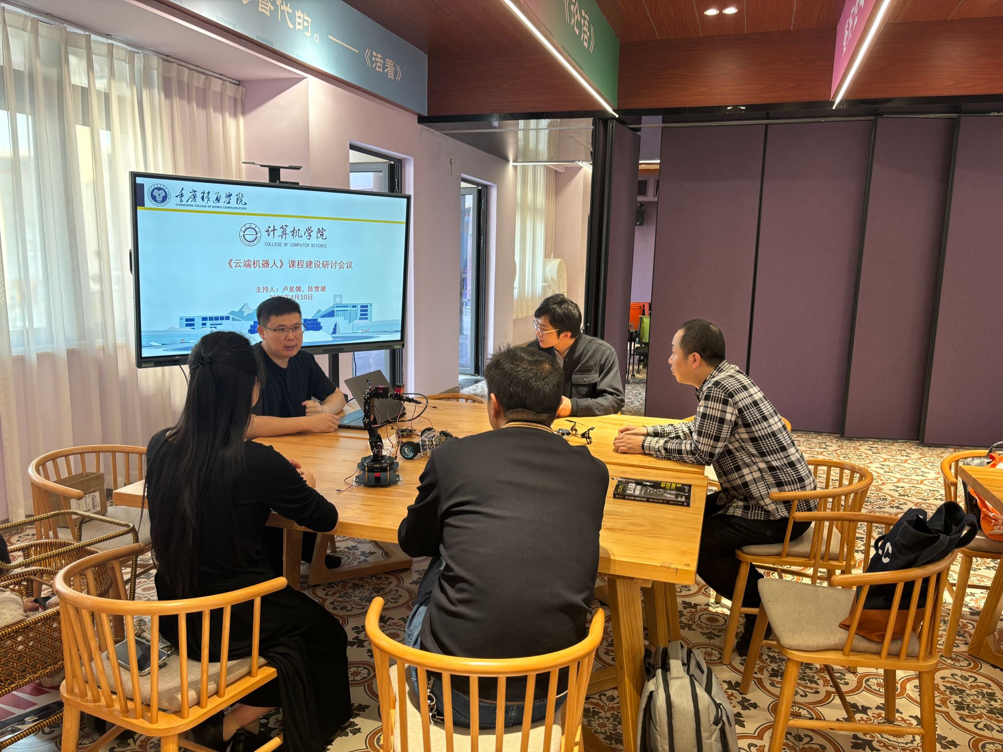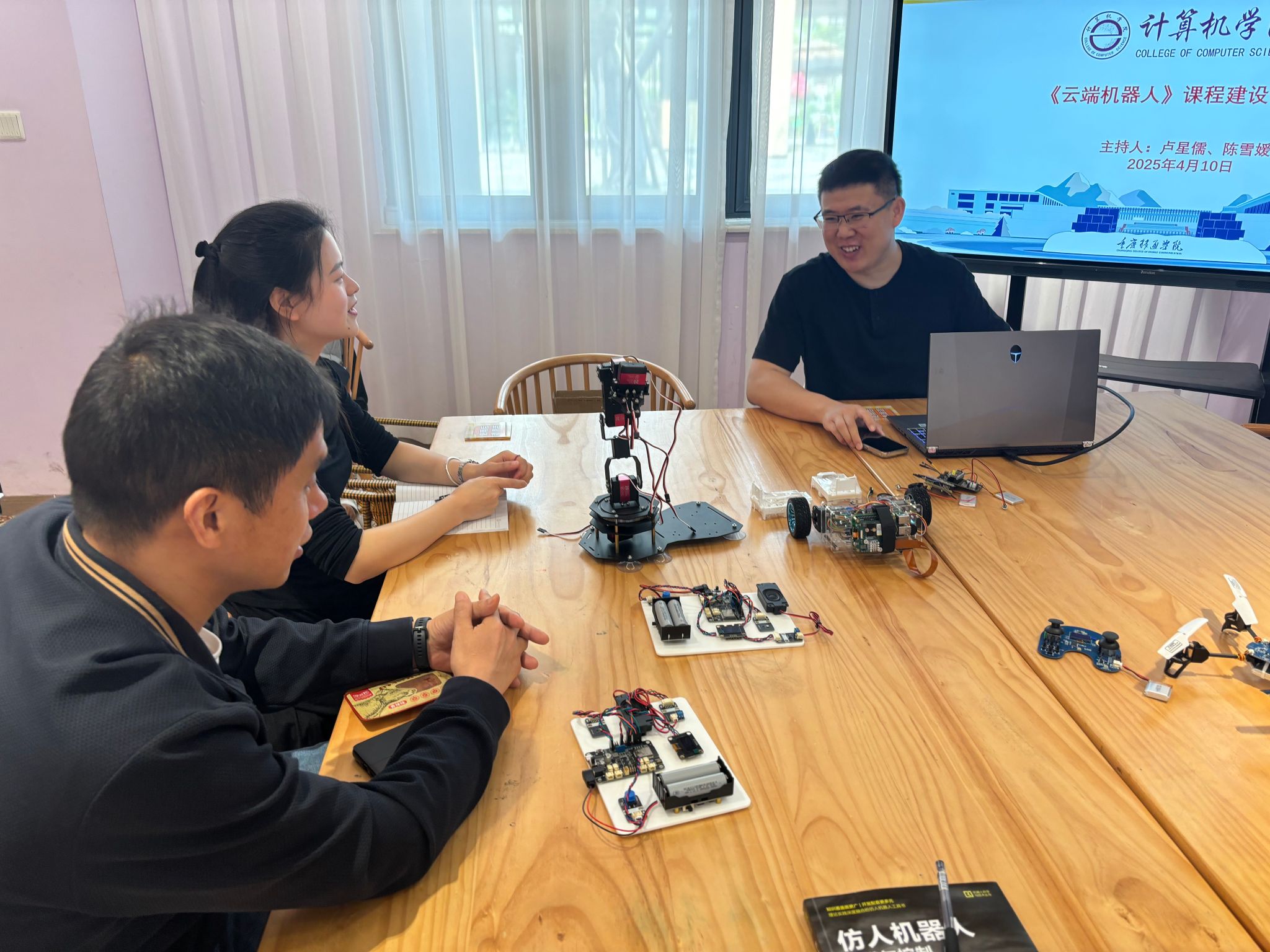 2025年4月14日中午,计算机学院《云端机器人》课程组联合实训中心,组织召开《云端机器人》课程建设专题研讨会。计算机学院卢星儒、陈雪媛、徐政、李修元,实训中心向春红,通工学院周绪林等教师代表参会。会议围绕课程阶段性总结、教学大纲修订及实践教学优化展开深入讨论,旨在推动课程内容与行业前沿接轨,提升学生实践创新能力。