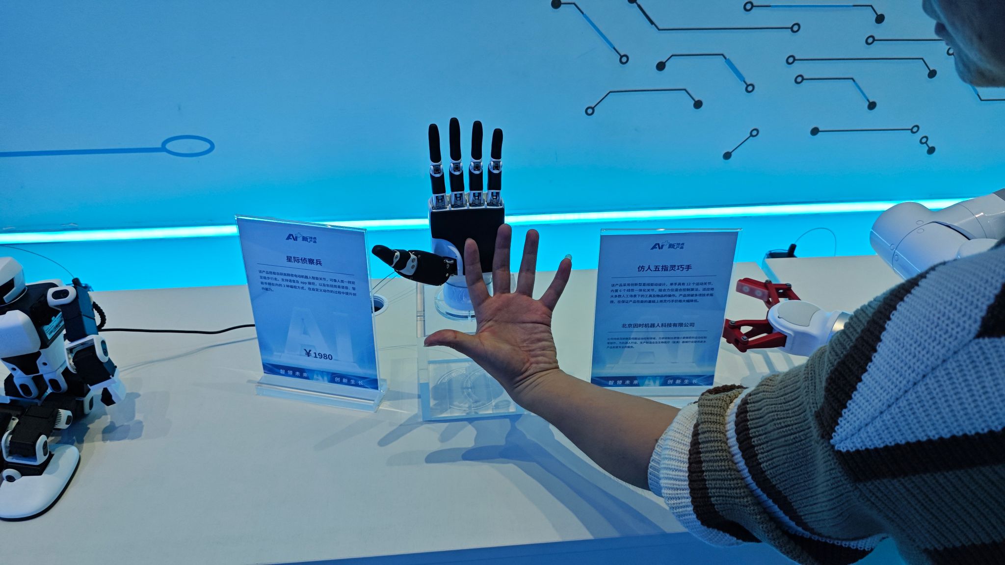 在智能终端展区,仿人五指灵巧手以其高自由度和精准抓取能力吸引了代表团的关注。该设备通过模拟人手的肌腱结构与多传感器融合技术,实现了对物体形状、材质和重量的自适应抓握,不仅能够完成精密装配、维修等工业任务,还可应用于医疗辅助、生活服务等场景。其核心突破在于解决了复杂环境下精细化操作的难题,通过迭代优化传动系统与控制系统,实现了力量控制与灵活性的平衡。这一技术为智算融合应用综合实验室在机器人感知与控制方向的研究提供了重要借鉴,尤其在工业自动化、智能医疗等领域的应用开发上具有指导意义。