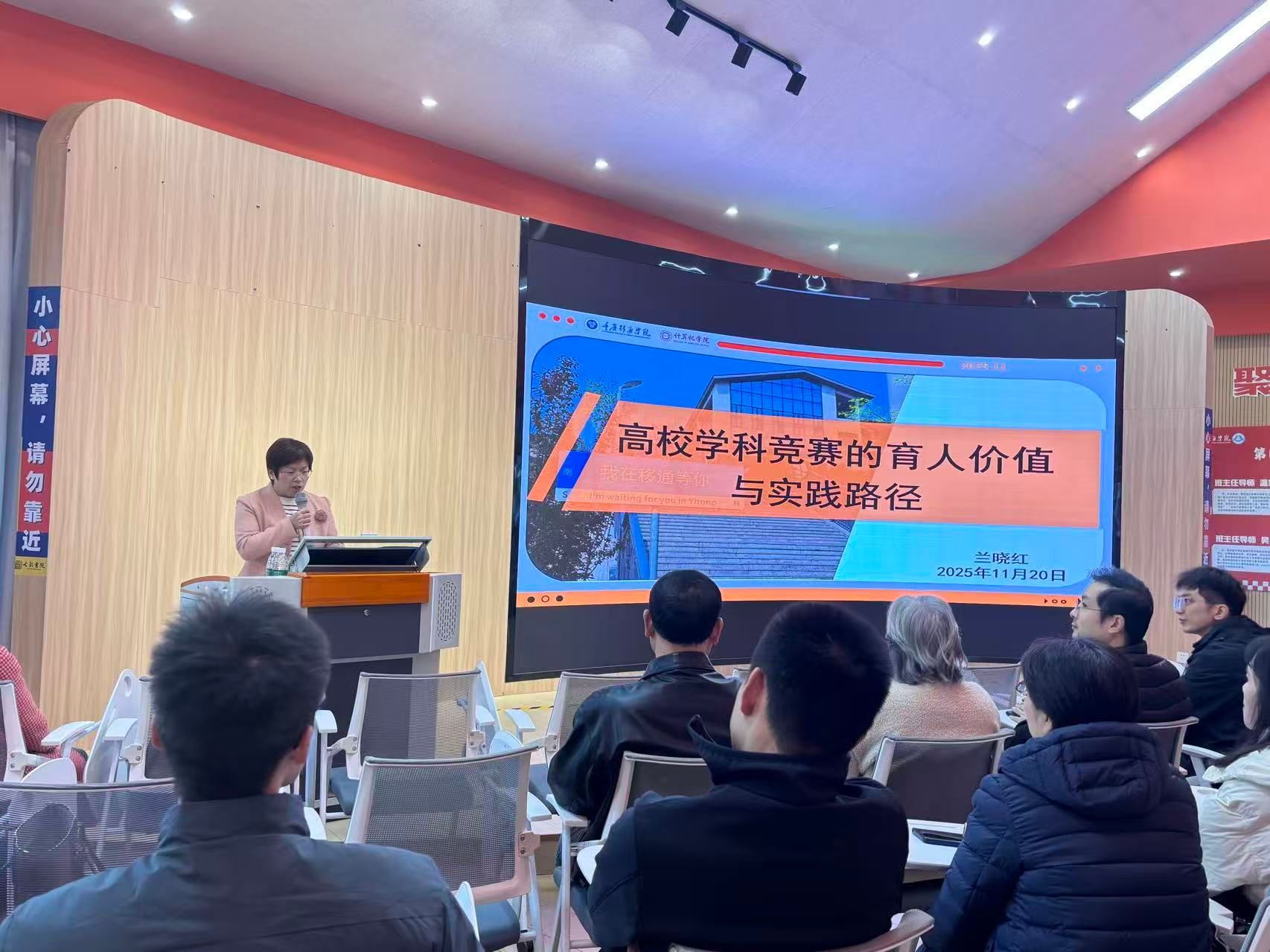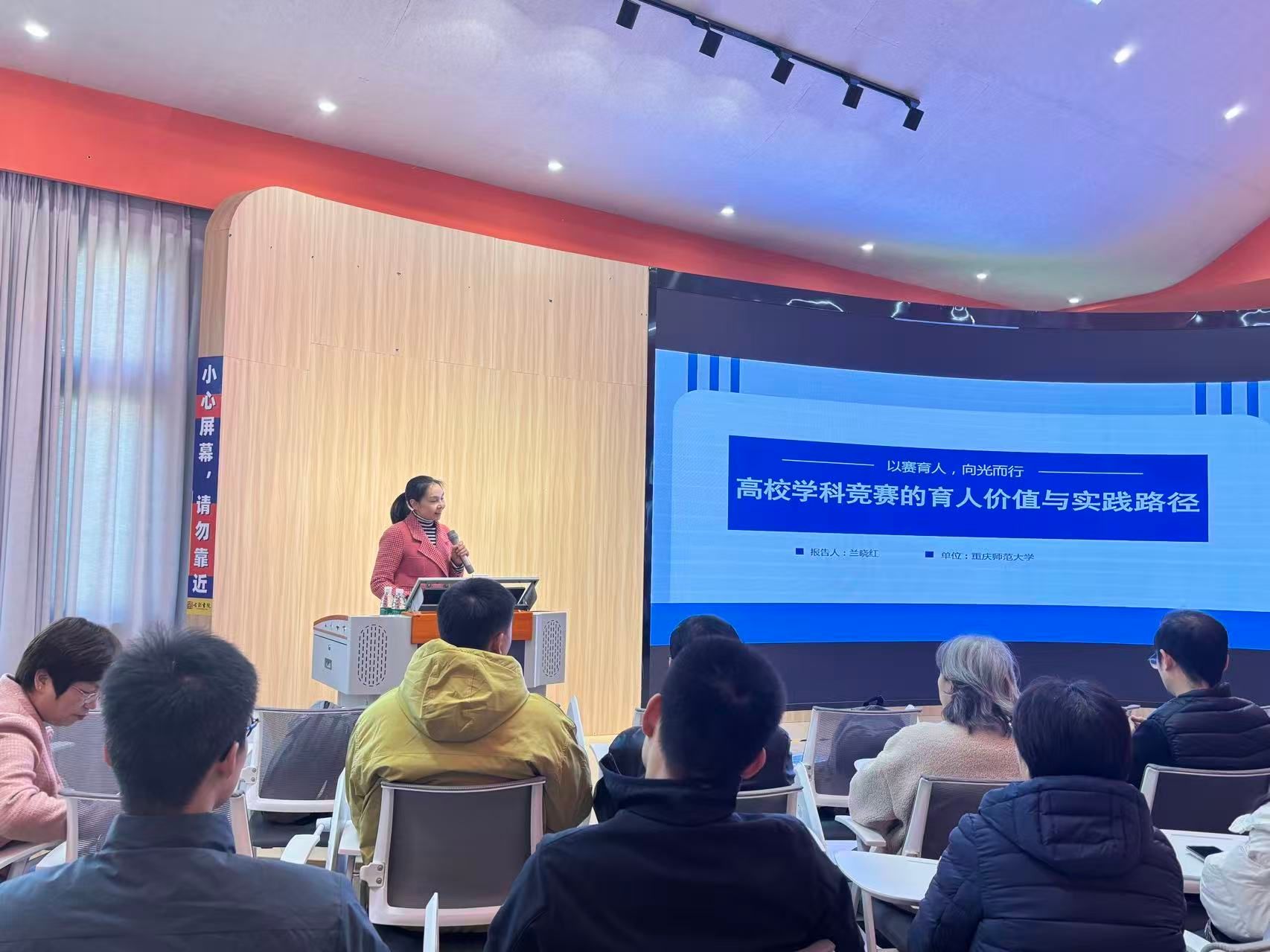 兰晓红教授从“育人价值”与“实践路径”两个维度展开深入讲解。她首先结合多年指导学科竞赛的丰富经验,系统阐述了学科竞赛在激发学生专业兴趣、培养团队协作精神、提升综合实践能力等方面的重要意义。她指出,学科竞赛不仅是检验教学成果的试金石,更是促进学生全面成长的有效途径,能够有效衔接理论教学与实践应用,实现知识、能力、素质的有机融合。