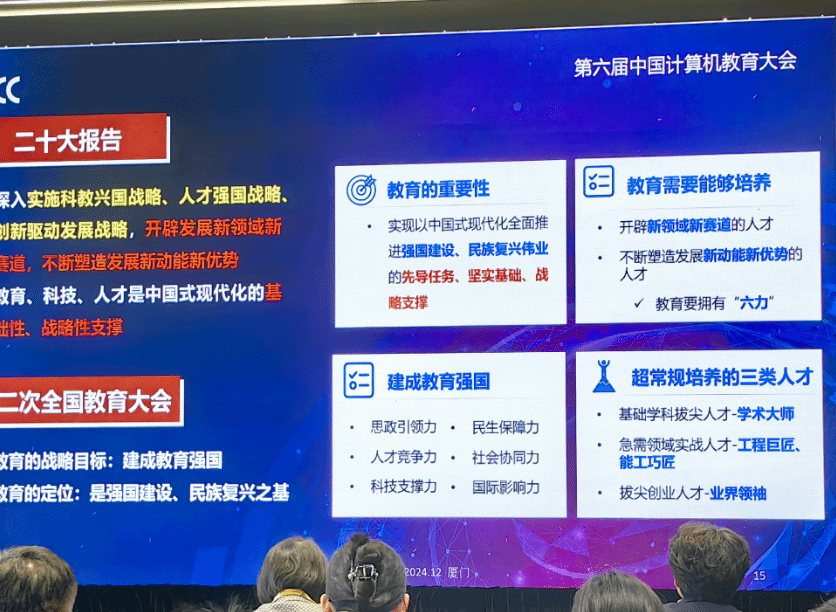 本网讯(文/图 甘振韬)2024年12月7日,计算机学院副院长林泽金及学院计科专业负责人甘振韬参加了第六届中国计算机教育大会(CECC)。本次大会以“新时代·新格局·新成就”为主题,旨在深入贯彻党的二十届三中全会和2024年全国教育大会精神,致力于将教育发展、科技创新与人才培养三者紧密结合共同推进,加快高质量计算机教育体系建设。