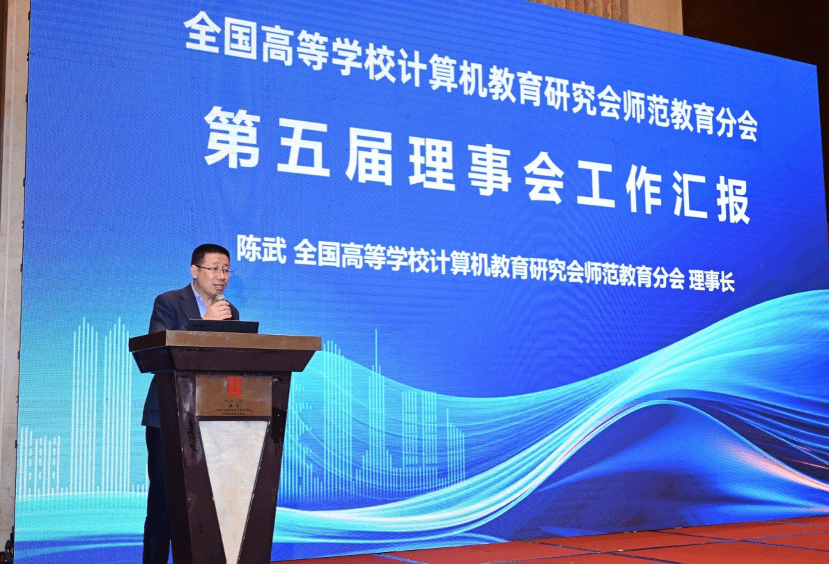 全国高等学校计算机教育研究会师范教育分会理事长西南大学陈武教授对各位嘉宾的到来表示热烈欢迎。他指出,此次年会是一个学术交流的平台,面对人工智能时代的挑战,师范院校计算机学科应积极响应国家创新驱动发展战略,深化产教融合,加强师资队伍建设,提升教学质量和科研水平,为培养更多高素质的计算机专业人才贡献力量。同时,陈理事长代表第五届理事会做了工作报告。