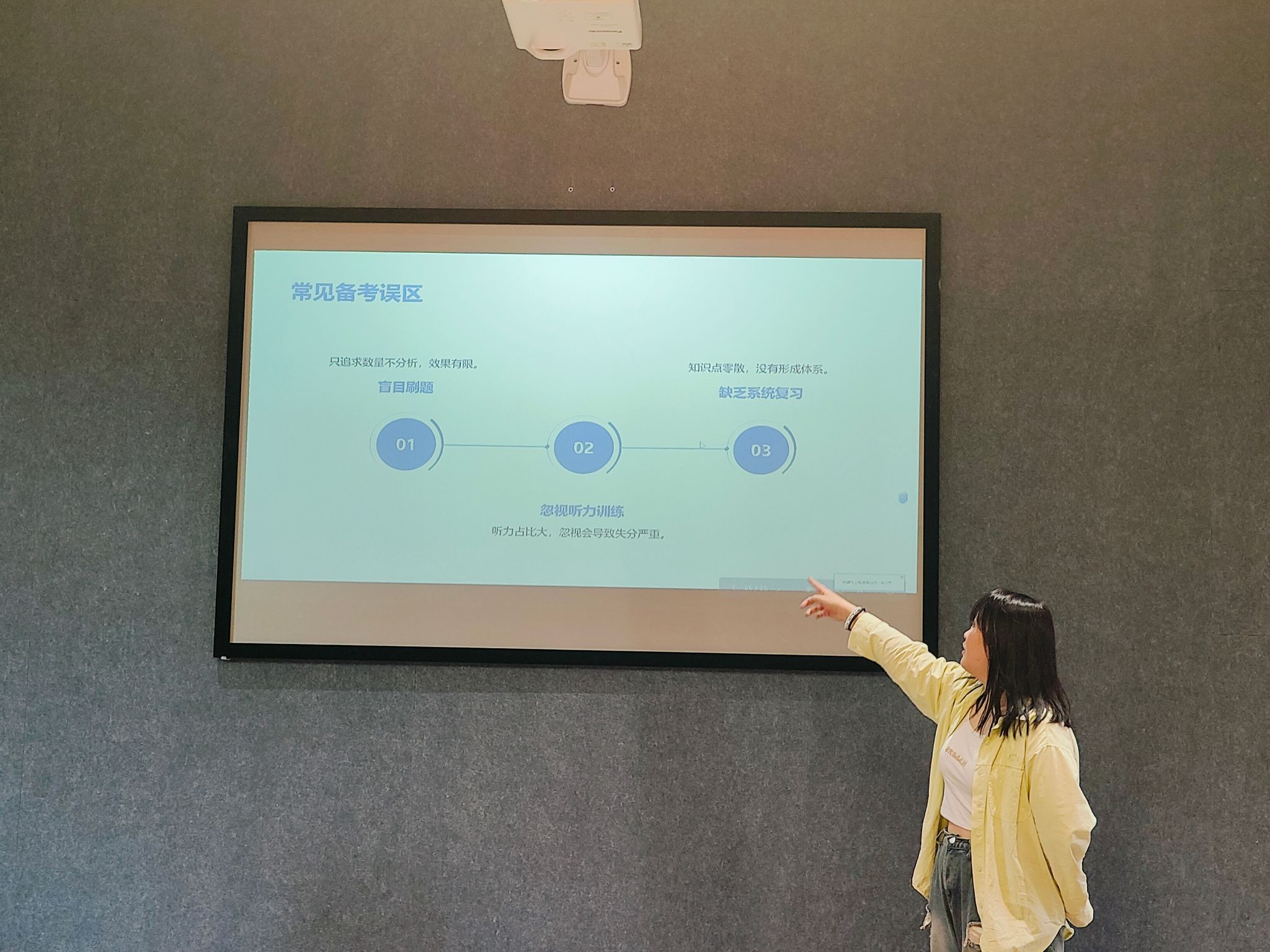 参与四级备考活动的老师中,有的老师负责讲课和辅导,有的老师负责准备学习资料、制作PPT,大家各司其职。此外每位老师都倾向于自己擅长的部分,比如李修元老师擅长英语听力,所以学生们的听力培训就由李修元老师负责。