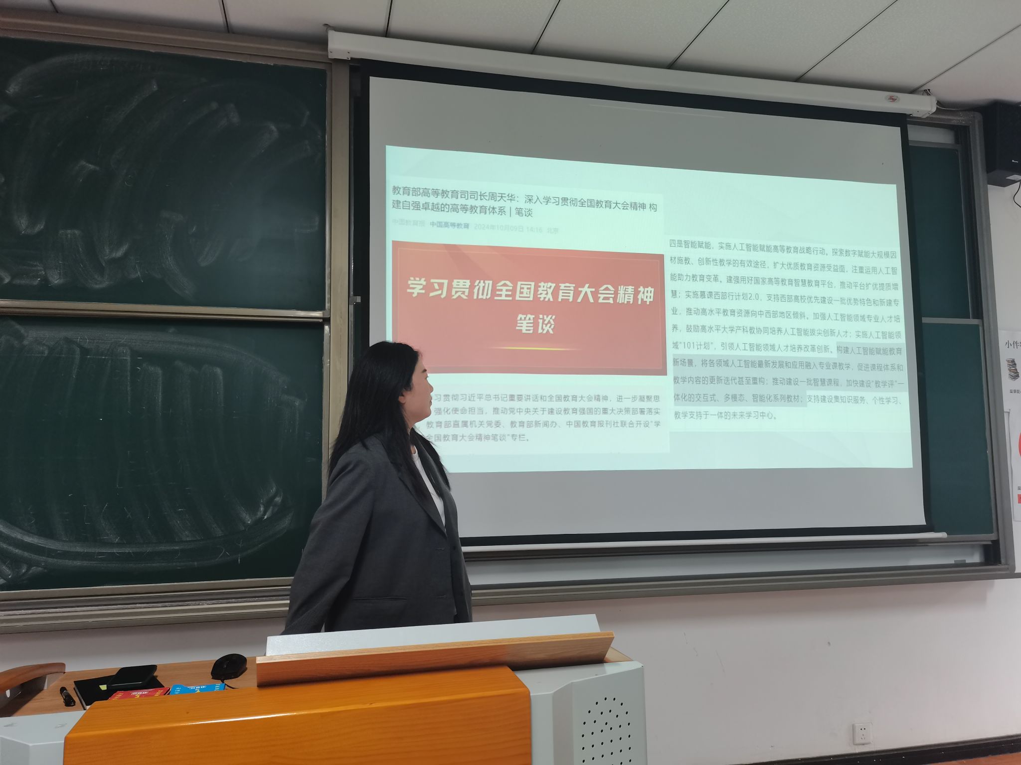会议伊始,陈雪媛老师以“学习贯彻全国教育大会精神笔谈”为切入点,深度剖析了人工智能与高等教育融合的时代背景。她援引《中国教育现代化2035》中“构建智能时代教育新生态”的战略部署,指出AI不仅是技术工具,更是推动教育公平、提升育人质量的核心引擎。“从‘经验驱动’到‘数据驱动’,从‘统一施教’到‘精准赋能’,AI正在重塑教育的底层逻辑。”陈老师以铿锵之语,勾勒出人工智能赋能高等教育的战略图景,引发在场教师对教育变革的深刻思考。
