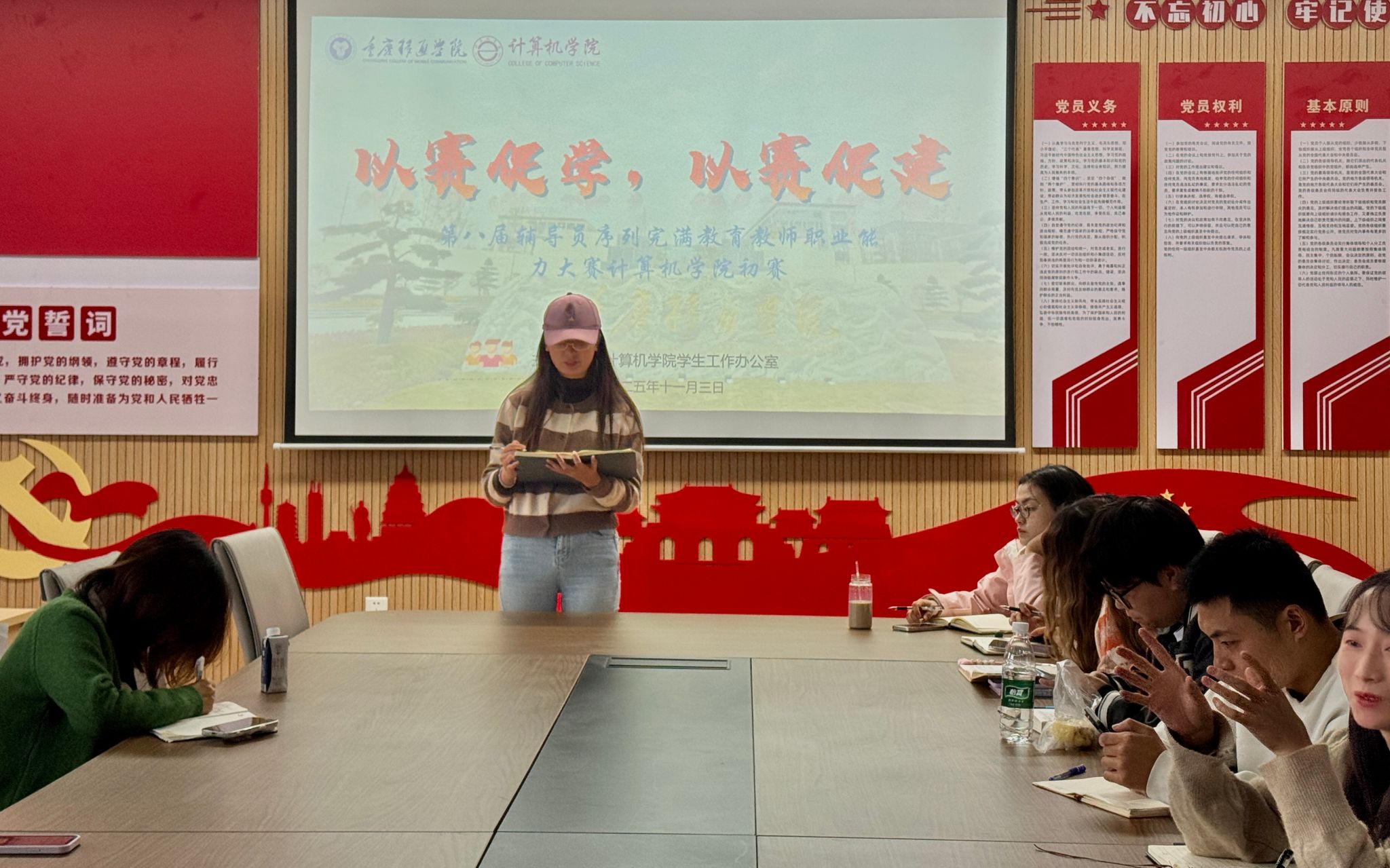 教育是国之大计、党之大计。为加强辅导员队伍专业素养与育人能力,推动新时代高校思想政治工作高质量发展。11月3日,计算机学院在勇者楼301举办了第八届辅导员序列完满教育教师职业能力大赛计算机学院初赛,来自计算机学院的各位辅导员积极参与,同台竞技。计算机学院党总支副书记周俊亲临赛场指导并全程监督,保障了赛事规范有序、公正严谨开展。