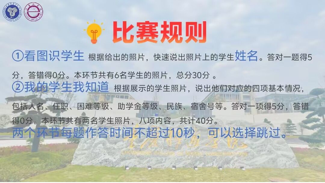 为确保比赛全程的规范与公正,全体参赛辅导员主动上交手机等通讯设备,按指定座位号有序入座,考场秩序井然、氛围严肃认真。主持人宣读比赛纪律与各环节注意事项,明确比赛流程及评分标准后,比赛正式拉开帷幕。此次比赛涵盖学生识别与基本信息考核、学生情况的深度掌握等内容,考核内容紧密贴合辅导员的日常工作,旨在考核辅导员对学生们的了解程度。