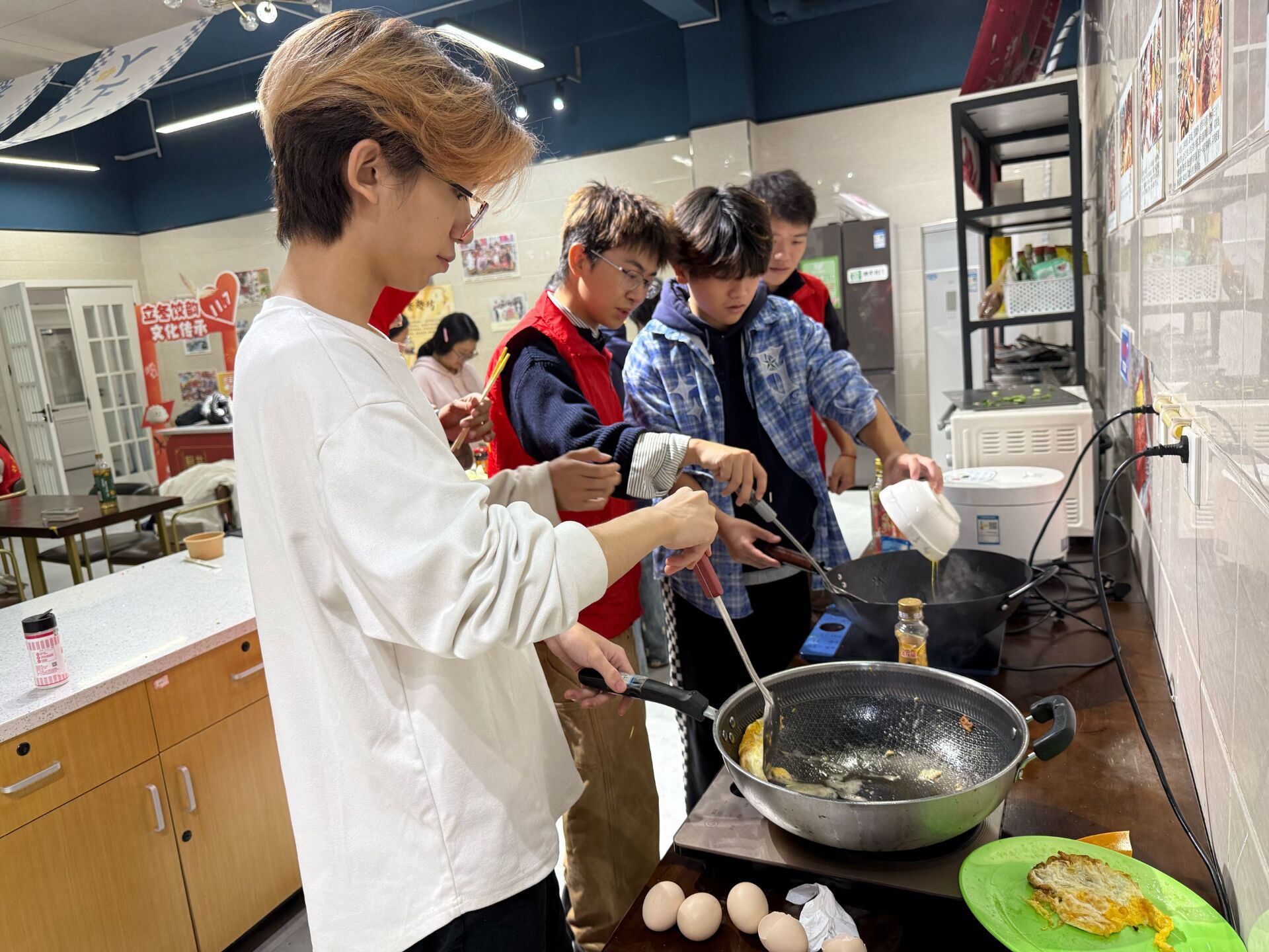 活动伊始,主持人为参与者带来了一场生动的“立冬文化小讲座”,从节气的天文意义到南北习俗差异,再到饺子作为情感载体的文化演变,让大家加深了对传统节气的理解。随后进行的“食材争夺赛”将气氛推向高潮。“飞花令”游戏中,同学们围绕“冬”“饺”“暖”“情”等关键字吟诗接句,妙语连珠;“看emoji猜成语”环节则笑声不断,各组争分夺秒,竞猜与立冬、美食、公益相关的趣味成语。