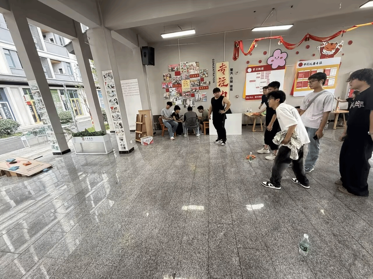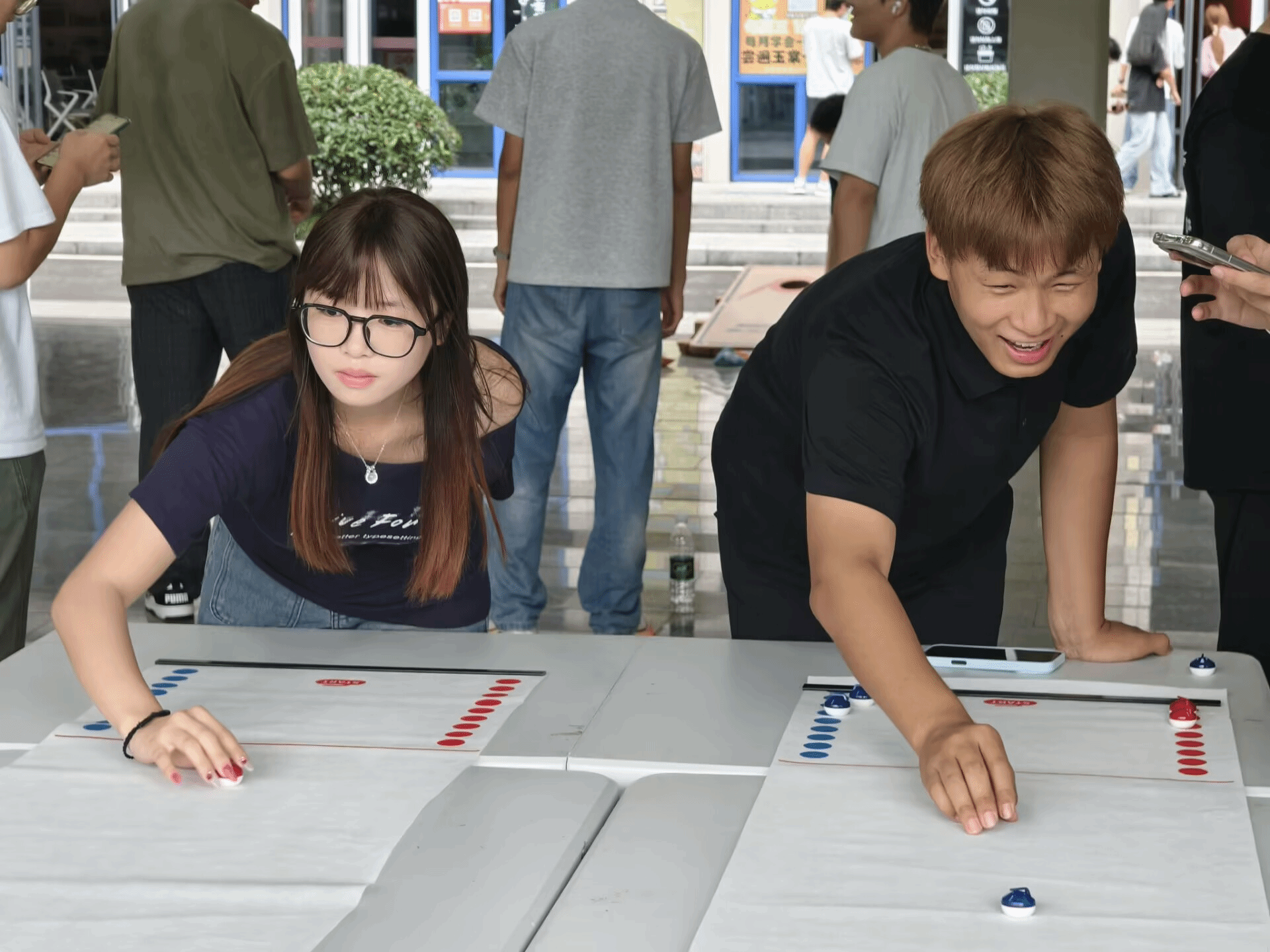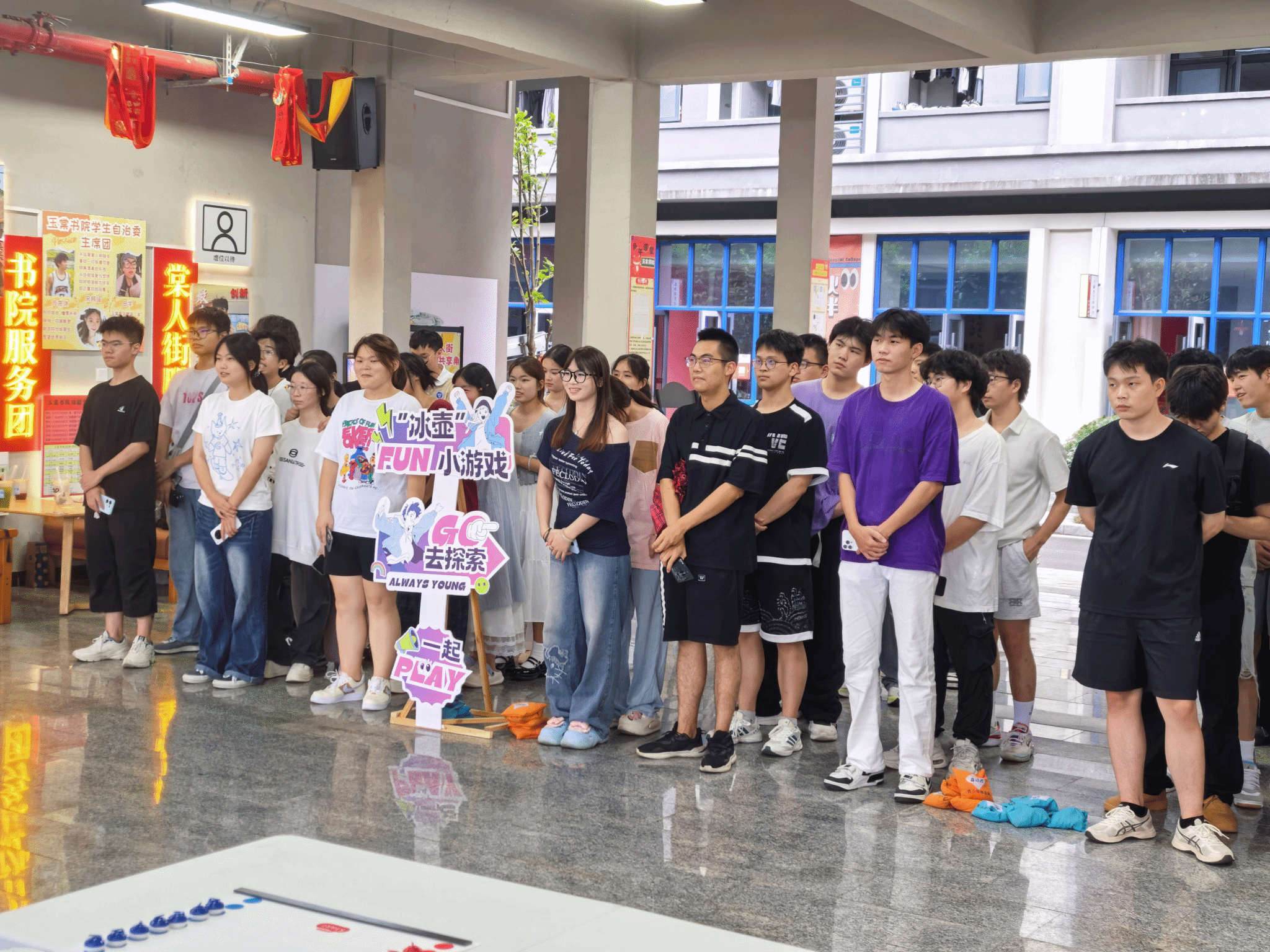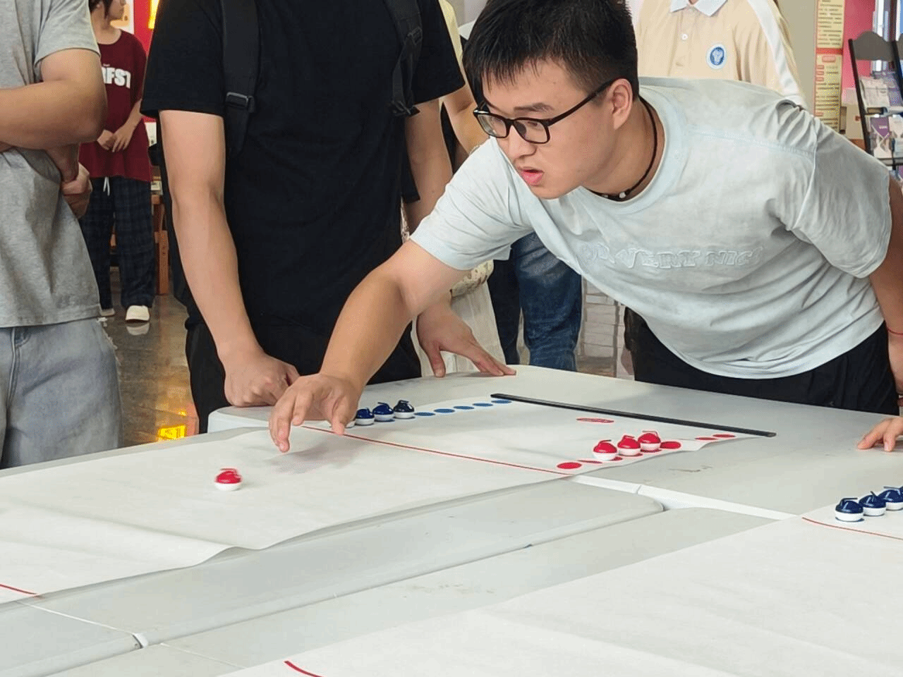接着,“骗子酒馆”桌游区传来阵阵惊呼与欢笑。同学们在推理与演技之间穿梭,每一次开牌都绷紧神经,每一次“侥幸逃脱”又带来畅快的“劫后余生”。而在另一侧的“桌面冰壶”赛场上,则是另一番景象:大家屏息凝神,小心控制着手腕的力道与角度,冰壶轻轻滑出,或在得分区稳稳停驻,或与其他冰壶轻碰改变战局——每一掷都考验策略与耐心。