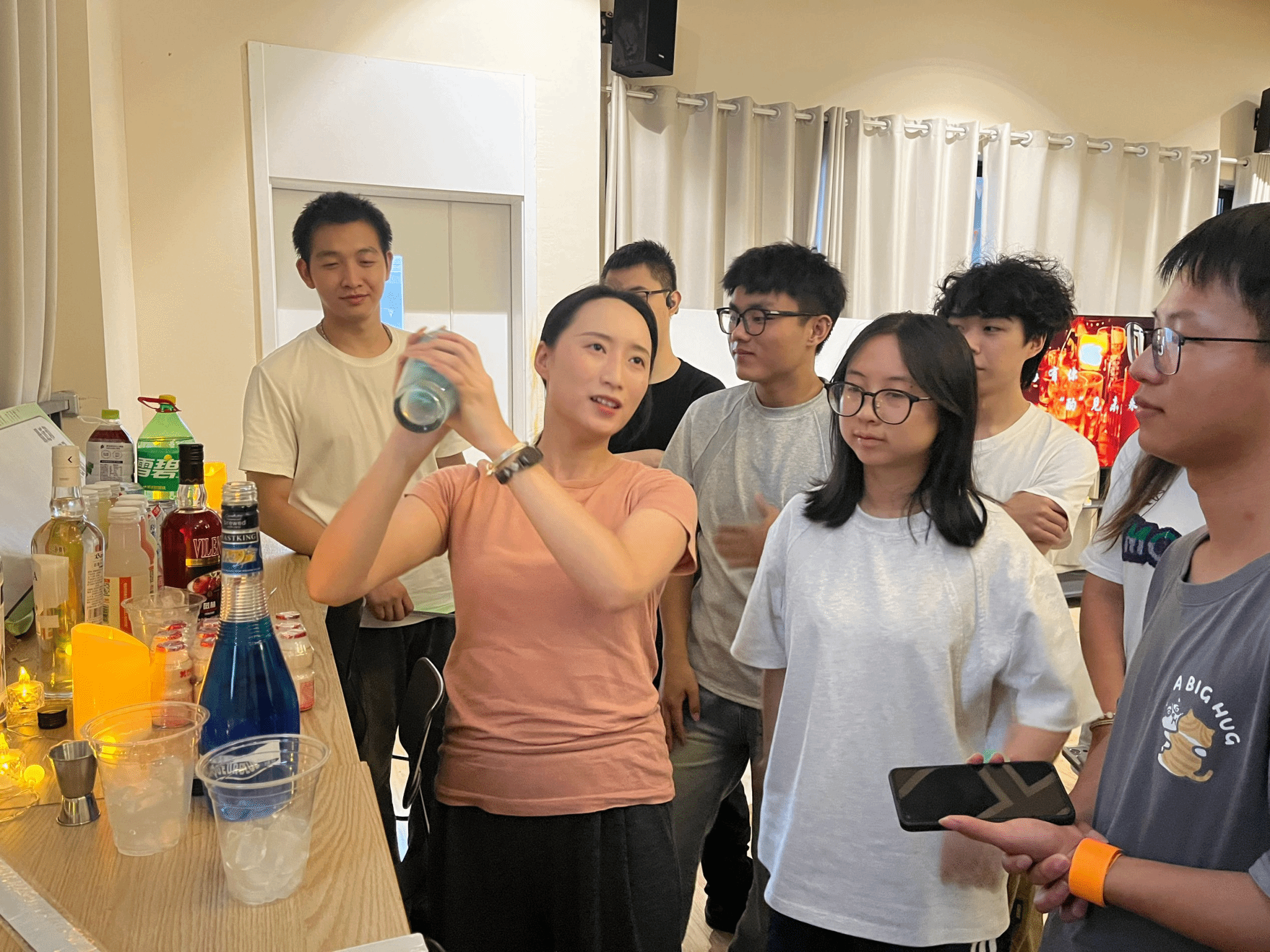夜幕渐深,活动进入最具氛围感的“创意调酒环节”。熊海秀老师化身“调酒师”,手持摇酒壶上下翻飞,每款饮品都被赋予专属寓意——“‘日出’送给正在低谷的你,相信黑暗过后总有光亮”“‘青柠之夏’代表纯粹的大学时光,酸甜都值得珍藏”。师生们手持特饮自由围坐,一起玩狼人杀的游戏促进交流,活动现场充满了欢声笑语,一群陌生人开始变得熟悉起来。