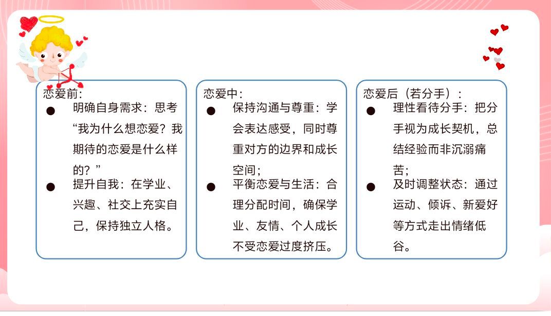 学院心理专项岗丁滢老师作为主讲人,围绕“恋爱中的权利与责任”这一主题,从爱情的定义、恋爱中常见的问题、正确对待爱情的方式以及恋爱中的权利与责任四个维度展开深入讲解。丁老师凭借丰富的知识储备,详细阐述了学生在恋爱过程中应如何精准维护自身合法权益,同时积极履行应尽的责任与义务。