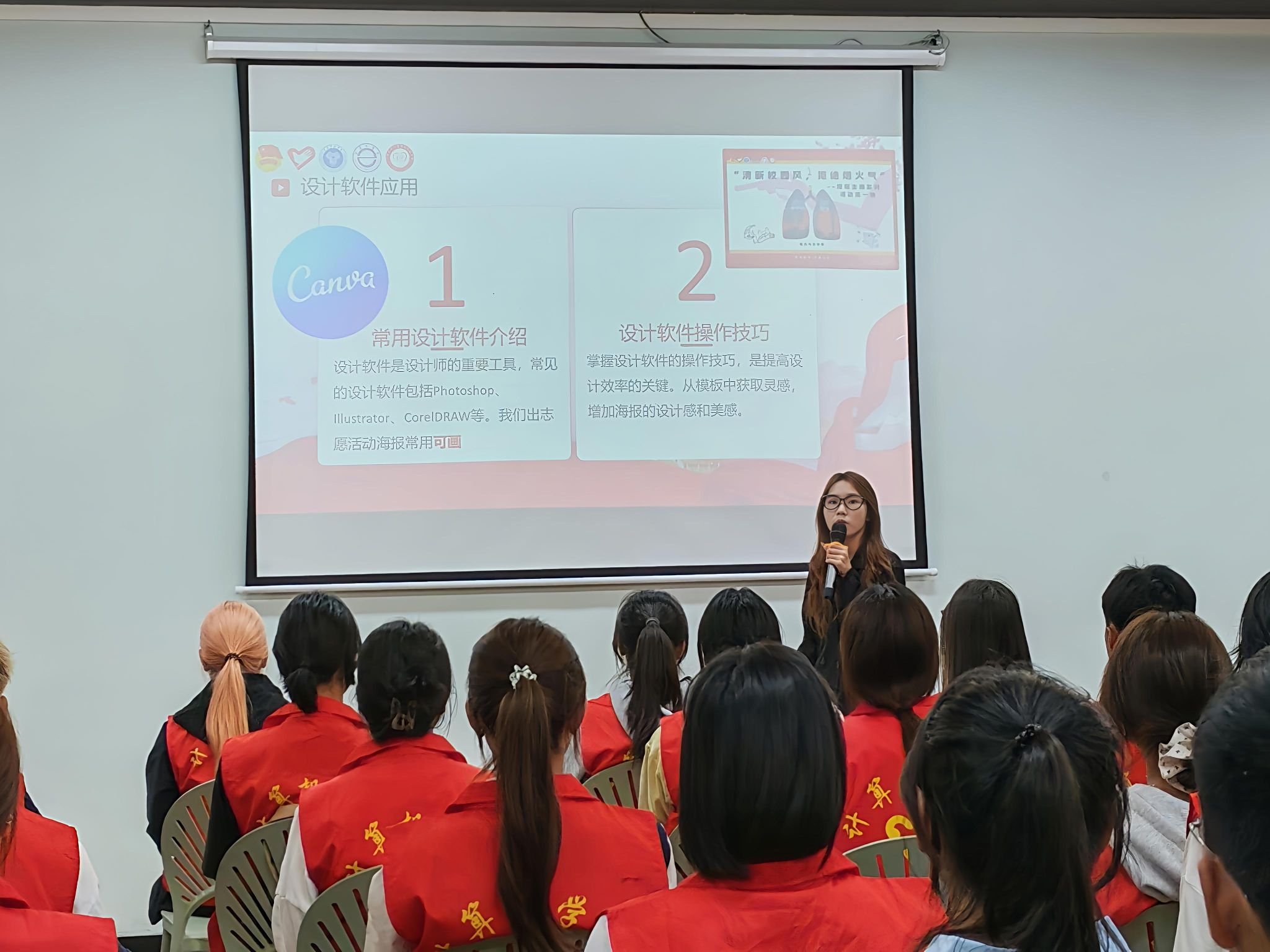 会上,三位部长倾囊相授:夏露月部长跳出参数与构图的常规讲解,引导大家通过捕捉关键瞬间,让静态影像诉说动态志愿故事;唐真部长从“视觉温度”出发,结合优秀海报案例,解密如何用色彩与空间将志愿服务的真诚转化为直击人心的视觉语言;黄士业部长在强调新闻稿格式规范与时效性的同时,更分享“于细节处见真情”的“有温度”写作心法。
