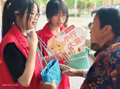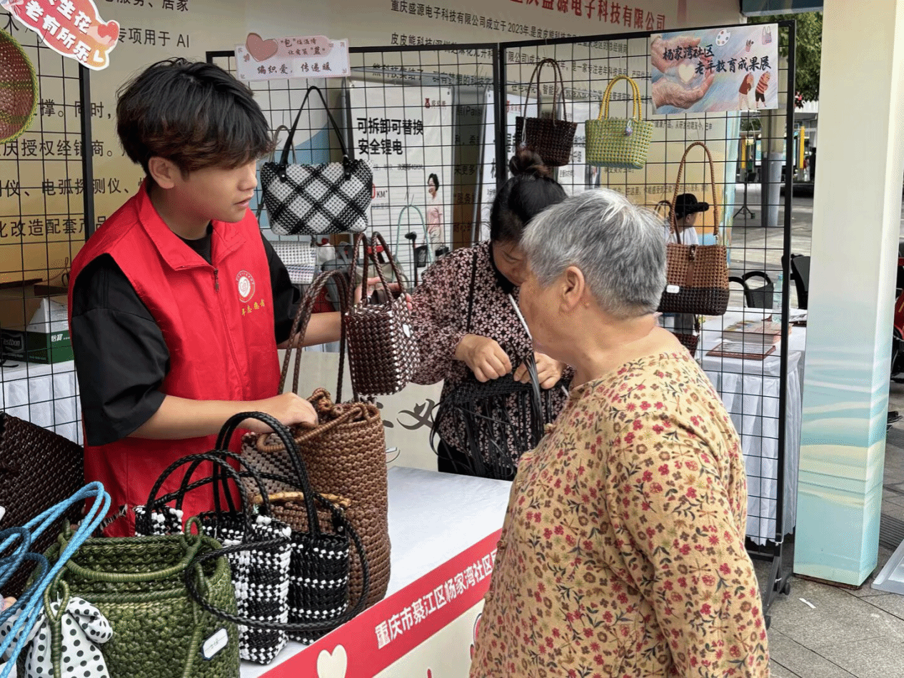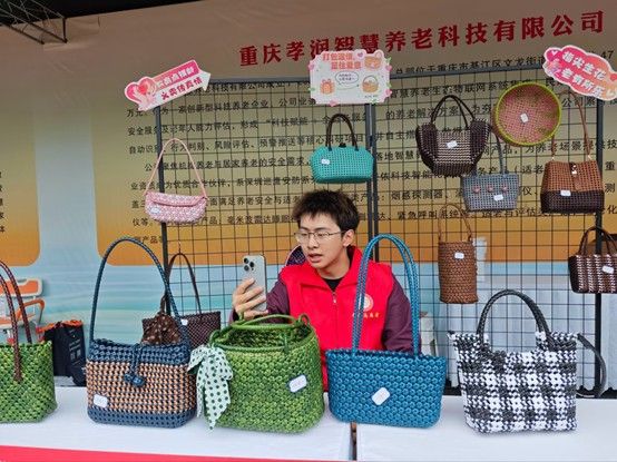义卖现场人头攒动,却始终井然有序。志愿者们精神饱满,分布在各个角落,全力投入服务。活动通过线下服务、线上直播与摄影记录三线并进,交织出一幅温暖而高效的公益画卷。面对驻足围观的居民,志愿者们主动迎上前,手捧精心编织的藤编包,细致讲解制作工艺与设计理念,当居民对款式犹豫不决时,志愿者便化身“贴心顾问”,结合对方的日常使用习惯,给出暖心推荐。而另一边的线上直播区,则成为公益传播的新窗口。几位志愿者变身“公益主播”,在镜头前流畅展示藤编包的细节与魅力。
