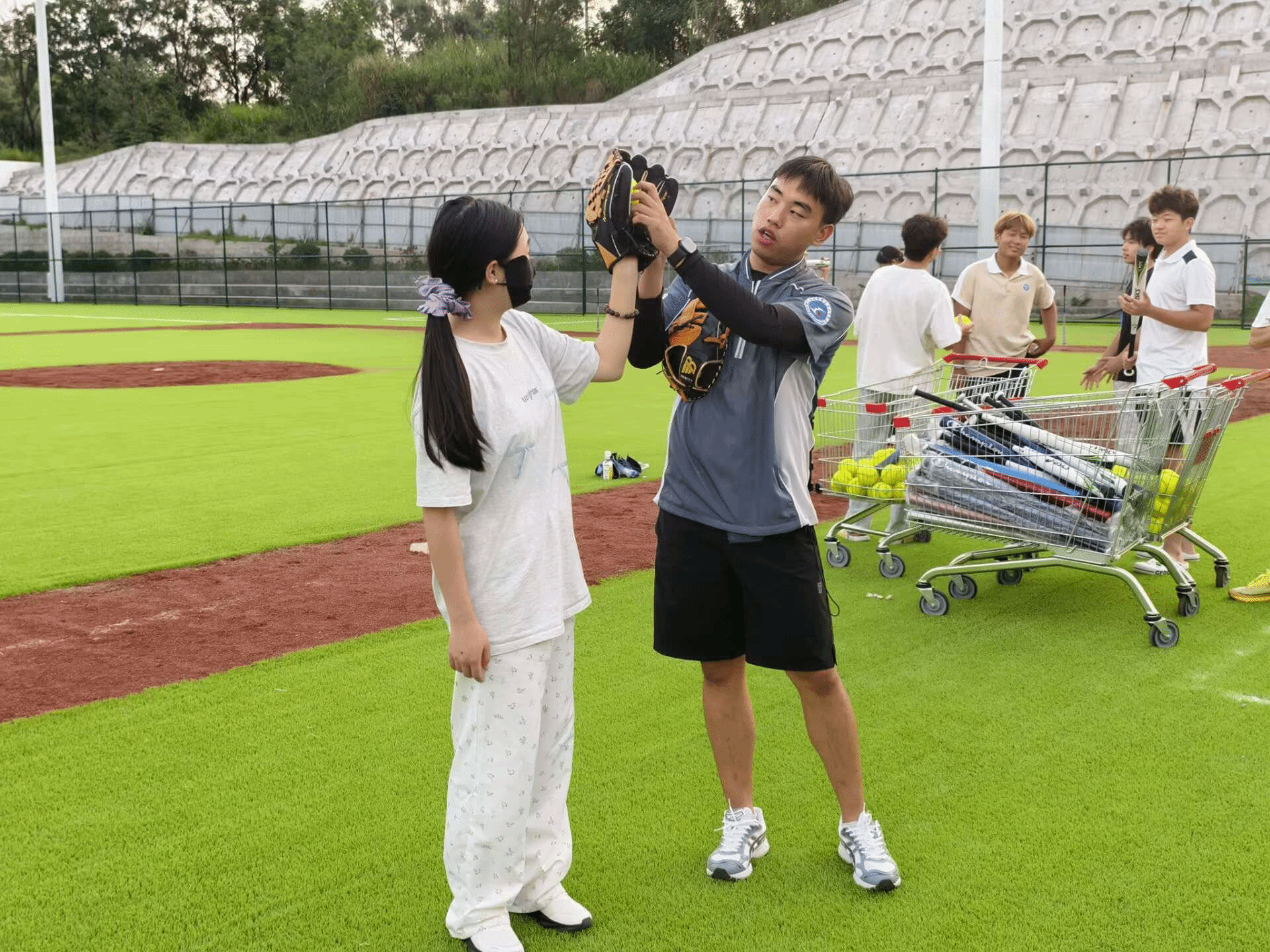 科普环节结束后,进入实操体验阶段,教练率先带领全体同学学习 “手套佩戴” 这一基础动作。教练一边示范标准佩戴方法,一边走到同学身边逐一调整,确保每个人的手套佩戴规范。随后,体验分为 “接抛球”“接地滚球” 两个基础技能训练:在接抛球训练中,同组同学两两结对,教练示范正确的传球姿势与接球动作,并巡回指导,纠正同学们的不规范动作;接地滚球训练时,教练模拟实战场景,滚动棒球让同学们练习弯腰、伸手套、稳定接球的连贯动作,不少同学从最初的 “频频漏接” 到逐渐掌握技巧,脸上露出了自信的笑容。