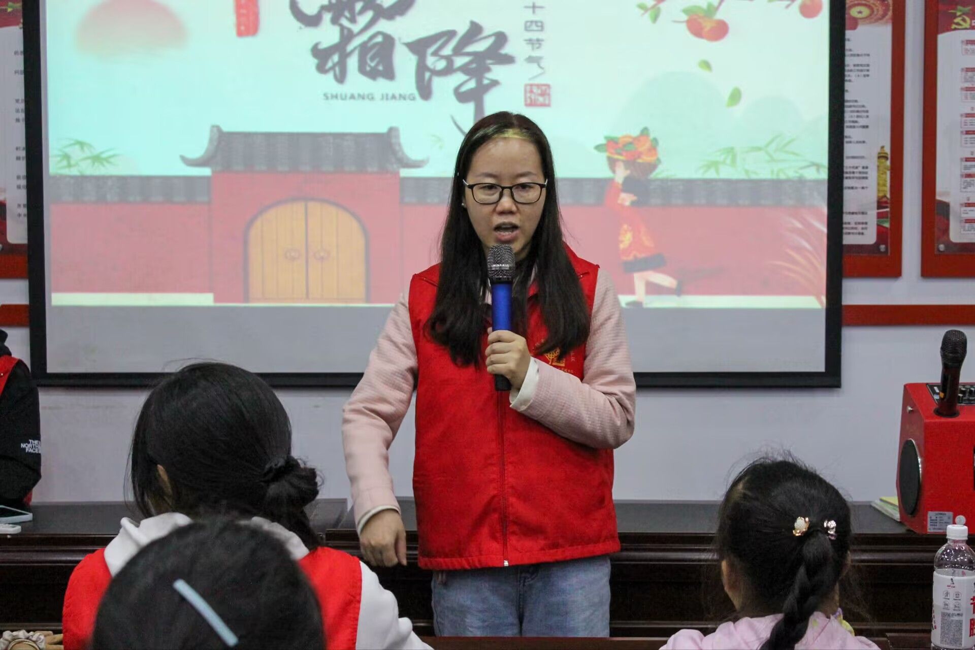 活动伊始,主持人以孩子们好奇的“霜降为什么要吃柿子”作为切入点,自然引出霜降节气的传统民俗。主持人站在讲台上,用他那热情幽默的讲解让传统用的民俗知识变得生动有趣,小朋友们在座位上兴奋地和旁边志愿者讨论着自己对习俗的认识。
