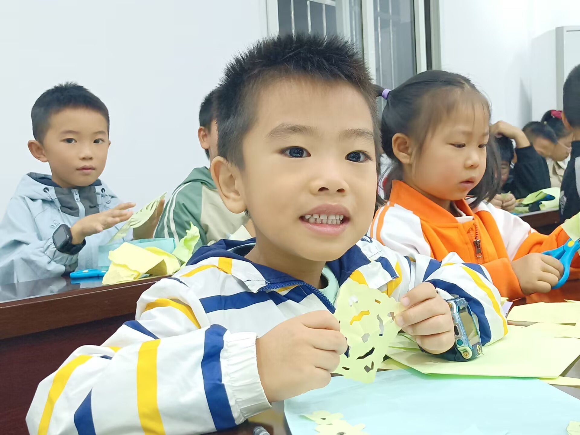 知识性的科普之后,手工环节将现场气氛推向高潮。志愿者们有序分发彩纸、剪刀等工具,孩子们发挥丰富的想象力,动手剪裁属于自己的霜降主题剪纸。不一会儿,形态各异的作品纷纷出炉:灵动的小鱼、火红的枫叶、绽放的菊花……每一件作品都承载着孩子们的创意与对节气的独特感知。