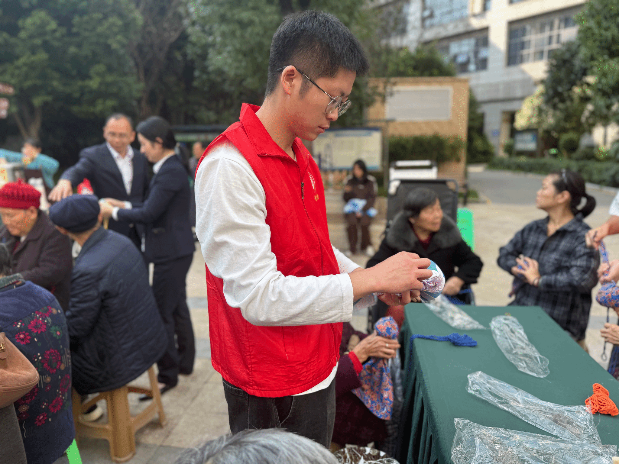 艾草锤制作环节是活动的核心亮点。志愿者们贴心的为老人们准备了艾草、布料、针线等制作材料,并将制作步骤拆解为一个个易懂的细节,耐心地为老人讲解示范。老人们也全神贯注地投入其中,一双双布满着岁月痕迹的手与年轻志愿者的手靠在一起。穿针引线间,艾草锤逐渐成型。这不仅是手工创作的成果,更是代际交流的桥梁,艾草民俗文化也在这手把手的实践中得以生动传承。