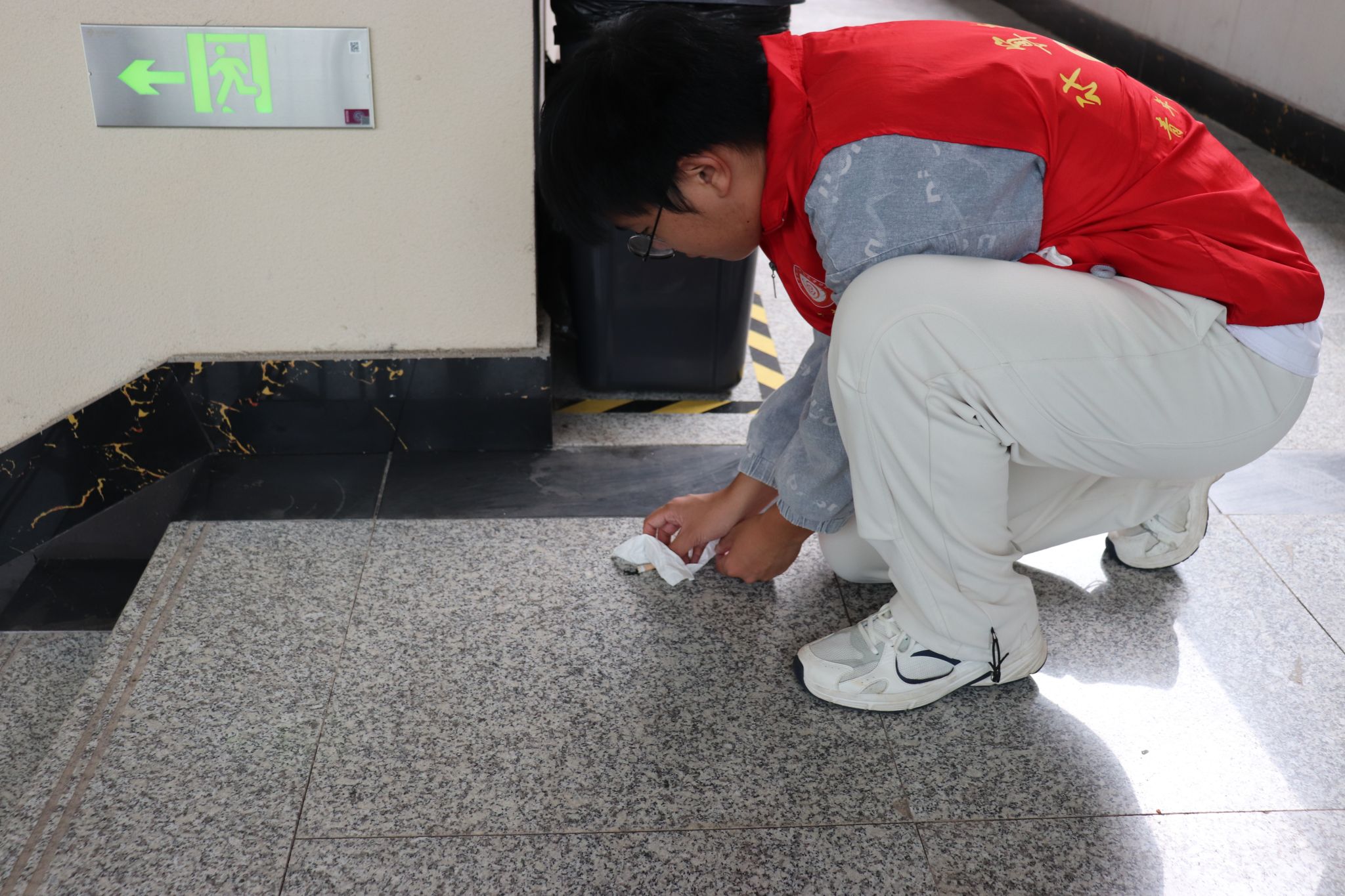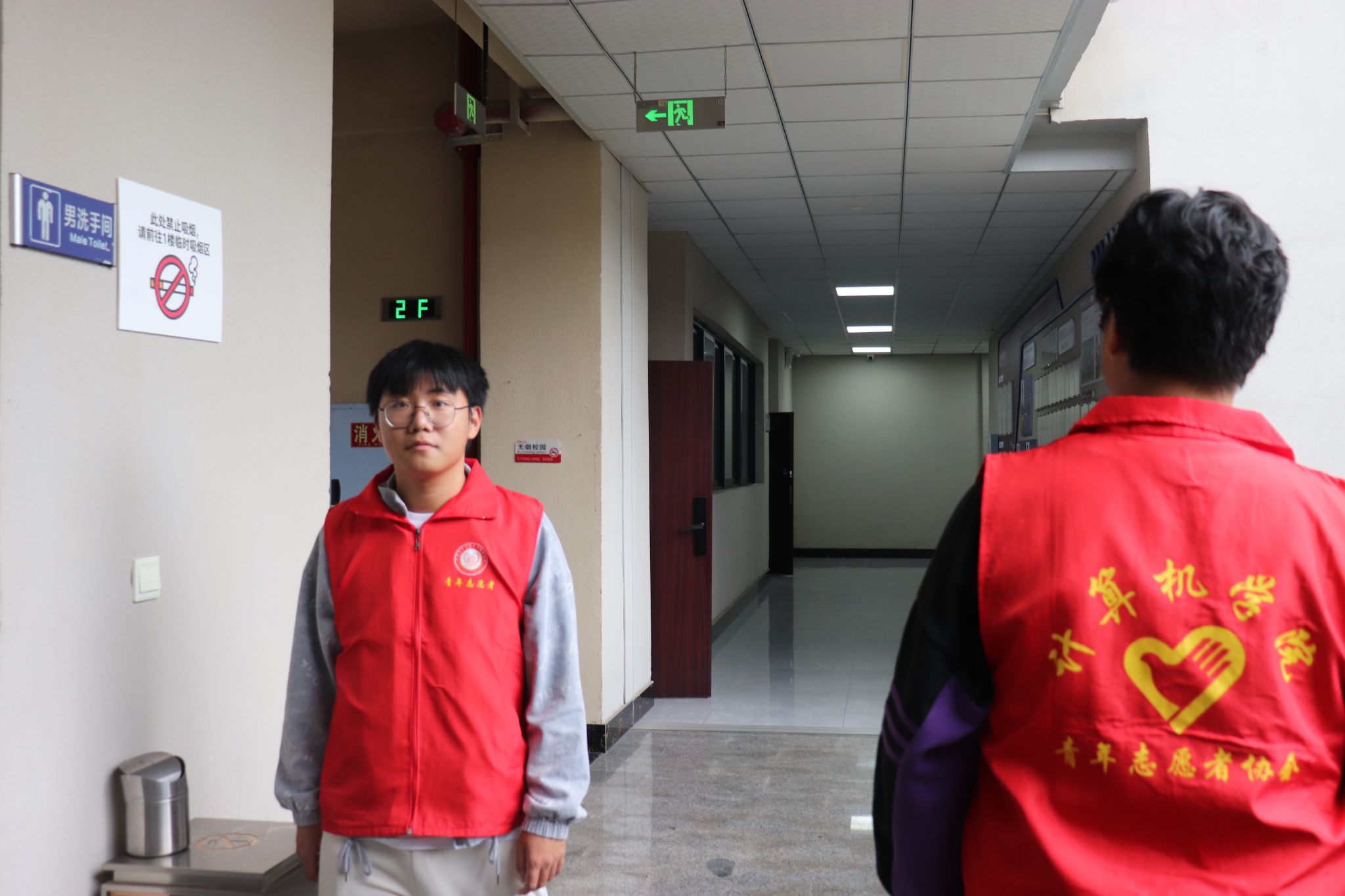 活动期间,身着统一志愿服装的志愿者组建了“巡楼控烟队”,制定了分时段、全覆盖的巡楼方案。志愿者们每日分时段轮流值勤,穿梭于勇者楼的走廊、楼梯间、厕所等多个公共区域,高频次开展巡逻排查工作,确保控烟无死角。在巡楼过程中,志愿者们始终密切关注是否存在吸烟现象,做到及时察觉、快速应对,以实际行动筑牢校园无烟防线,使控烟意识深入校园的每一处角落。