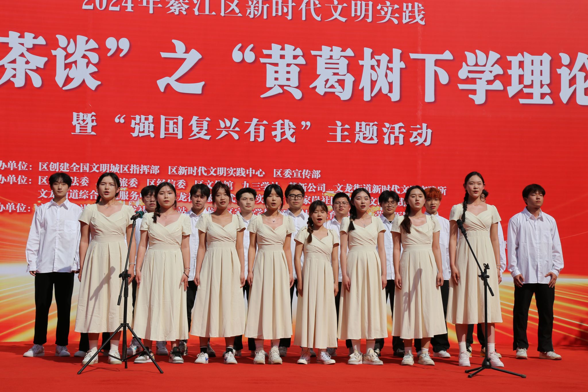 为深入学习贯彻习近平新时代中国特色社会主义思想,积极培育和践行社会主义核心价值观,大力弘扬中华优秀传统文化,并营造全国文明城区创建的浓厚氛围,增进民生福祉,计算机学院青年志愿者协会联合学院Fireworks合唱团参加綦江区志愿服务项目“南州茶谈”之“黄葛树下学理论”邻里守望、情暖家园活动,于2024年3月21日在綦江区文龙街道巨龙广场精彩呈现。本次活动主题围绕“强国复兴有我”,充分展示綦江区在新时代文明实践中的新风貌和成果。