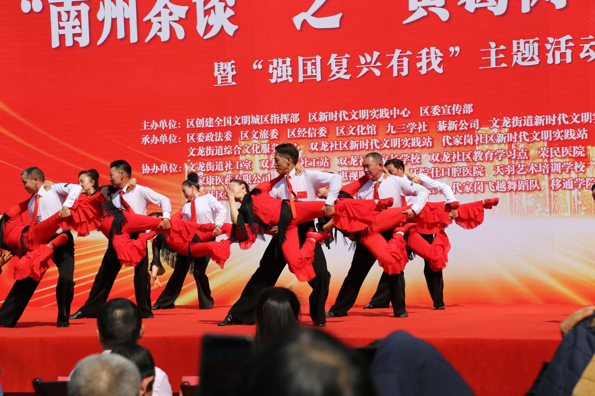 此次活动由綦江区委政法委、区文化旅游委、区经济信息委、文龙街道等多个部门联合举办,并得到了九三学社委员、文龙社区卫生服务中心等单位的领导和工作人员的大力支持,同时吸引了广大綦江区市民的积极参与。活动内容丰富多样,包括歌唱、评书、舞蹈、事迹讲述等多种形式,为观众带来了一场视听盛宴。