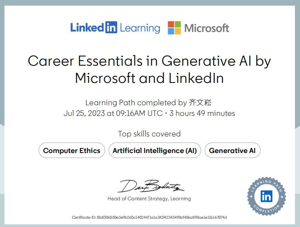 齐文崧:这些证书是对我专业能力的认可,使我在求职和职场晋升过程中更具竞争力。同时,考取这些证书也让我更加了解行业标准和最佳实践,对我的个人职业发展起到了积极的推动作用。