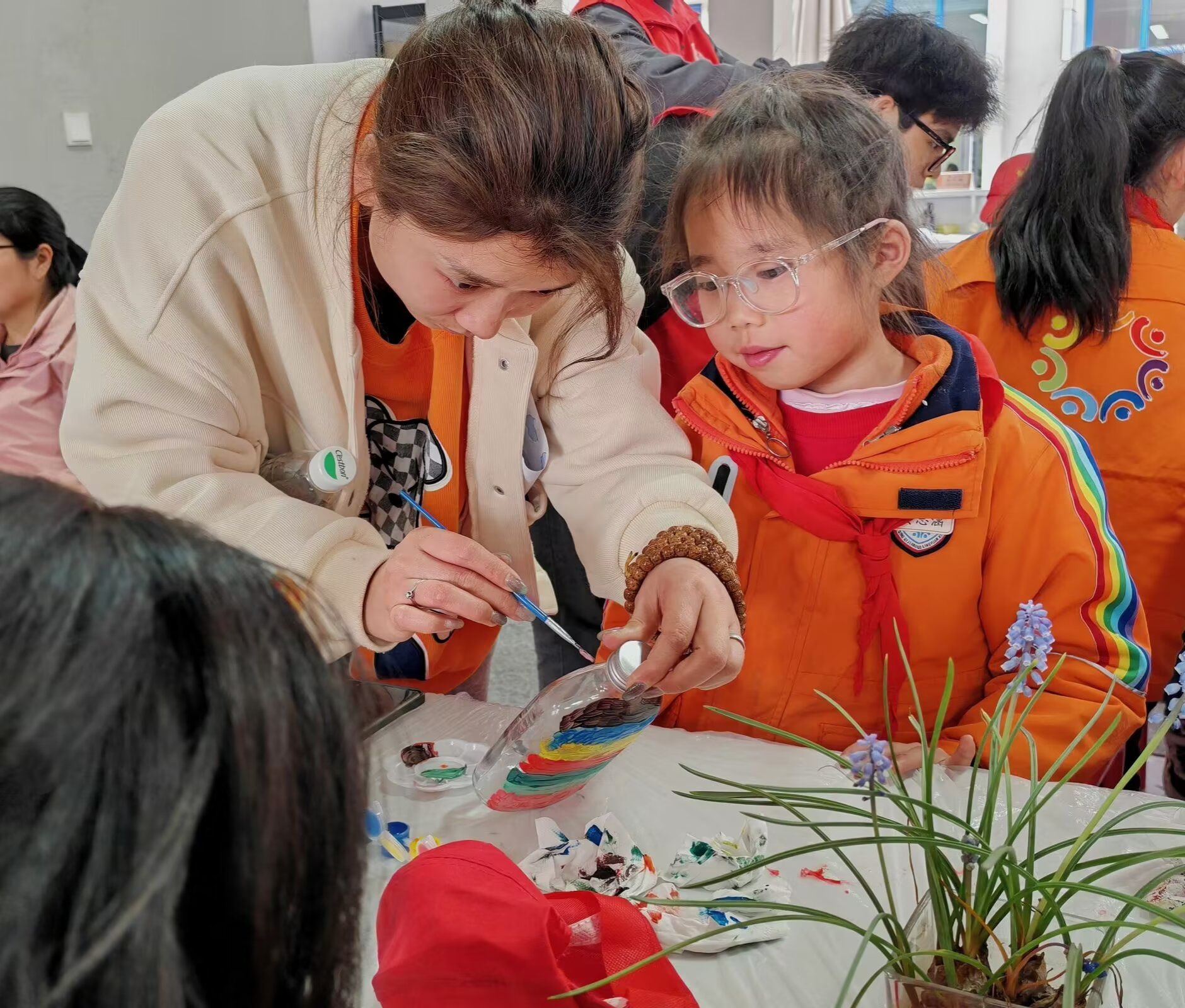 热闹的氛围中,小朋友们有的选择可爱的卡通人物模版慢慢“复刻”;有的热衷于色彩斑斓涂绘,用色彩释放心中的洒脱;更不乏依托想象的世界,结合植树节爱护环境的思考,画出心中的“树”。小朋友们充分发挥自己的想象力,用稚嫩的小手创造出一个个别出心裁的作品。涂绘过程中,志愿者们耐心指导,及时帮助孩子们抚瓶调色,在相互间的配合下,顺利完成了自己满意的植物瓶。