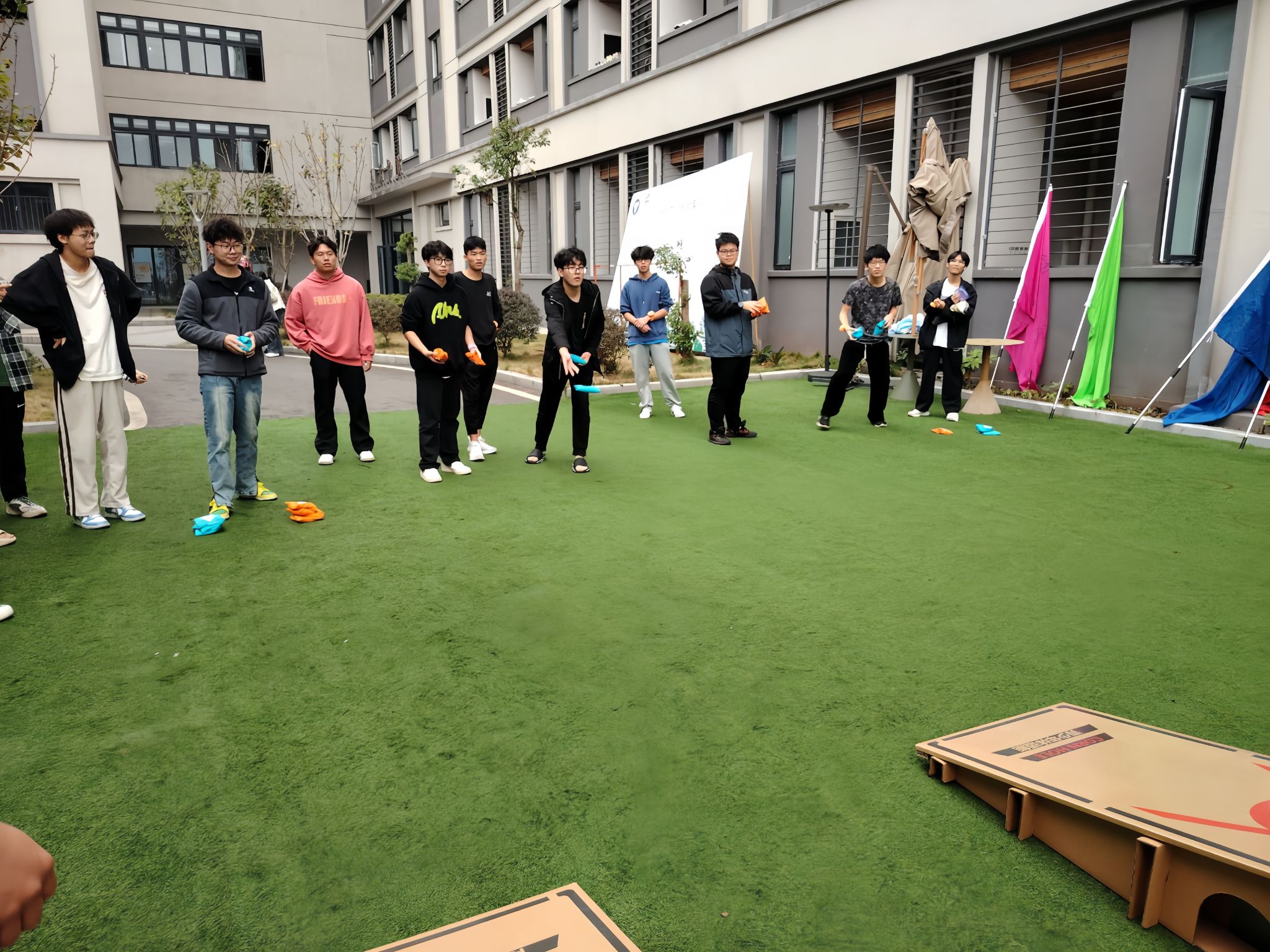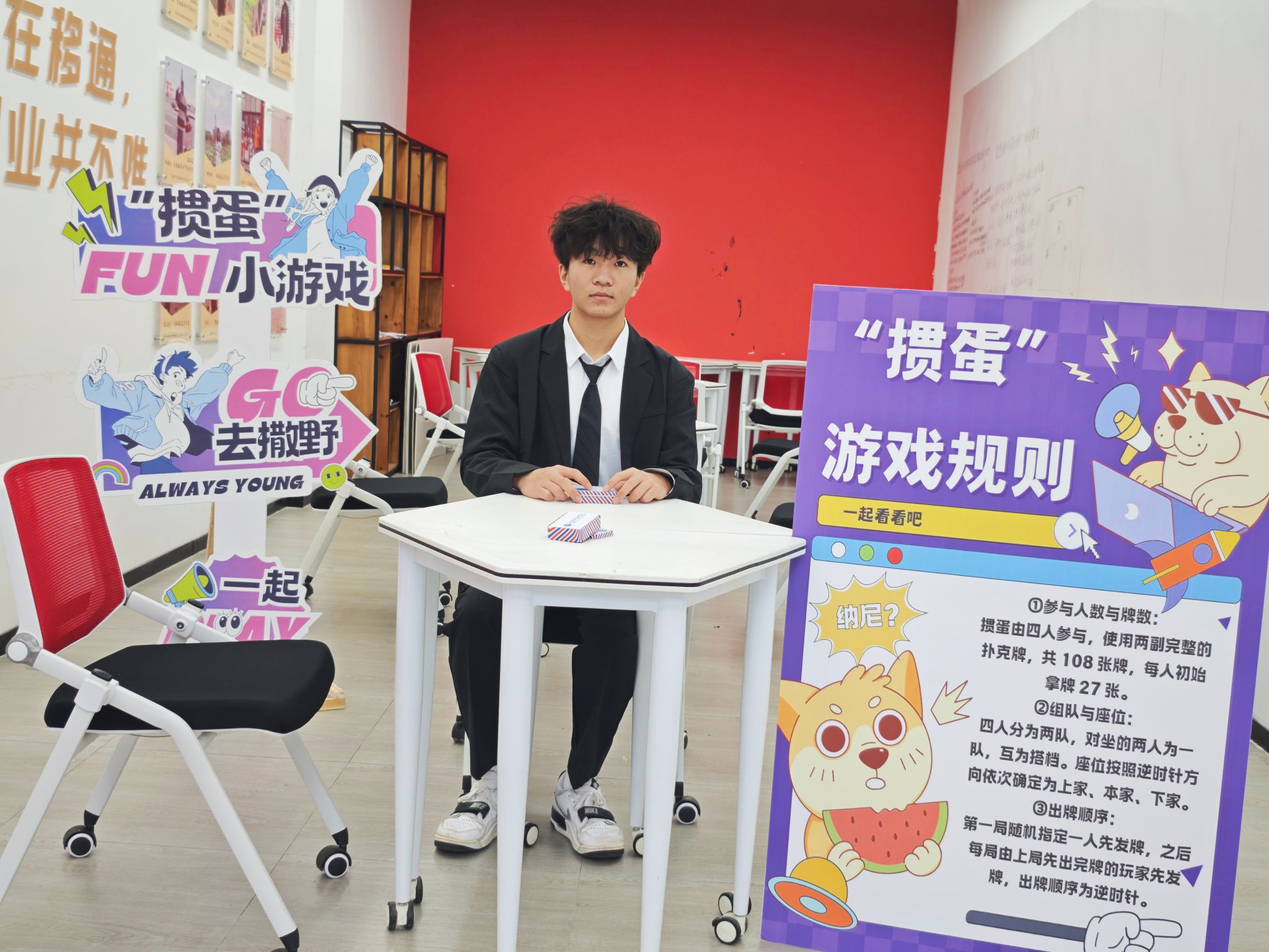 活动开始前,工作人员们忙碌的身影随处可见。他们精心布置着每一个角落,无论是掼蛋游戏所需的舒适桌椅和崭新纸牌,还是美式布袋球的目标斜板和色彩斑斓的布袋,亦或是桌面冰壶那光滑的桌面和精致的道具冰壶,都被摆放得恰到好处。每一个细节都彰显着工作人员的用心,只为给大家打造出最佳的游戏环境。