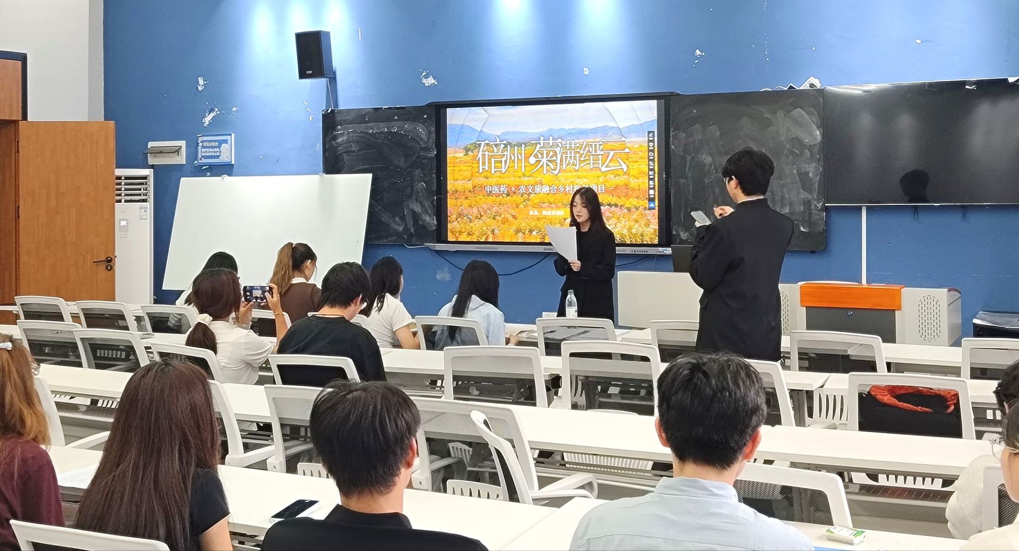 赛事正式启动,入围团队按抽签顺序登台,开展项目展示与答辩。各团队通过5-8分钟PPT演示,围绕乡村产业升级、生态保护、文化传承等核心领域,呈现项目背景、创新思路及落地方向,既有乡村特色资源开发方案,也有技术助力乡村数字化的构想;随后3-5分钟答辩中,团队从容回应评委关于项目可行性、与乡村需求适配性的提问,展现出对乡村振兴的深入思考和解决实际问题的能力。