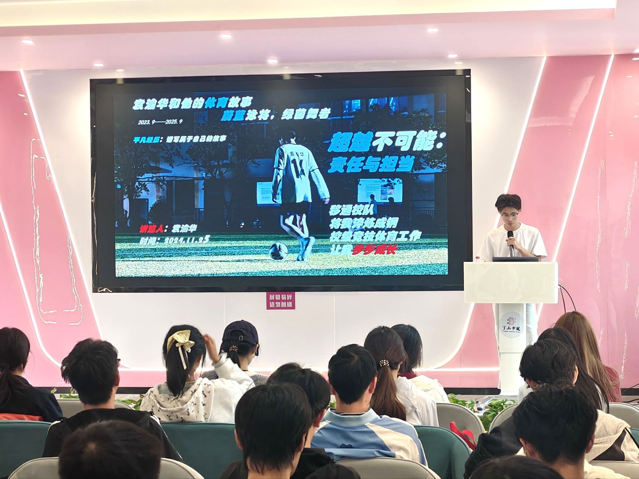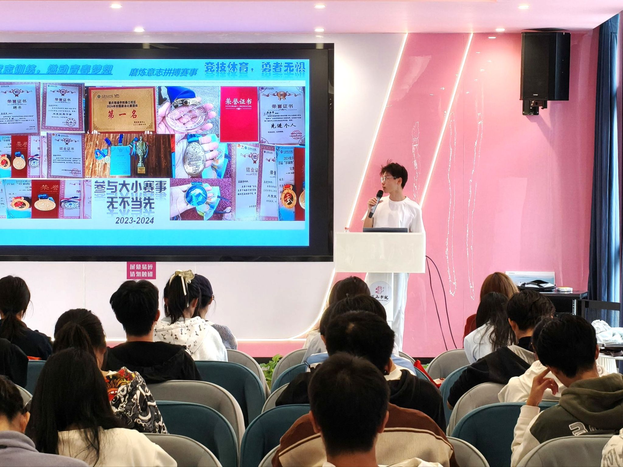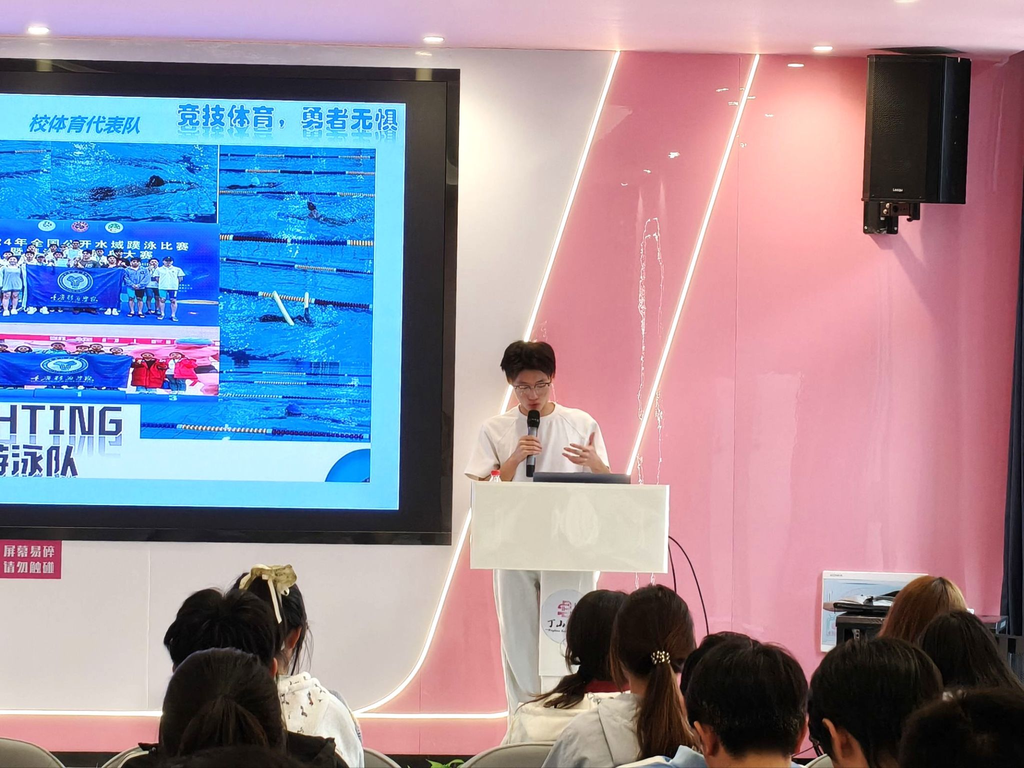 活动开场,袁渝华学长以个人履历展现“多维发展”路径。作为学习委员,他服务同学、协助教学;作为新生导师,为学弟学妹提供适应建议;作为国家三级运动员,他是校游泳队现役成员、原足球校队成员;同时担任校级学生体育联合会骨干,策划的校级完满教育体育活动累计覆盖师生上万人次。此外,他兼顾学业与实践,斩获国家级、校级、院级奖项十余项,树立“专业扎实、特长突出”的榜样形象。