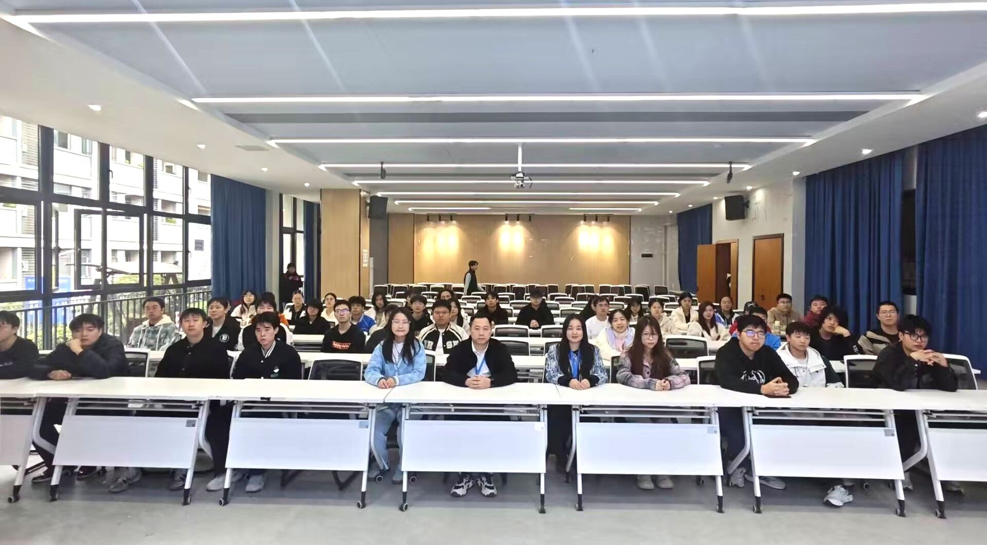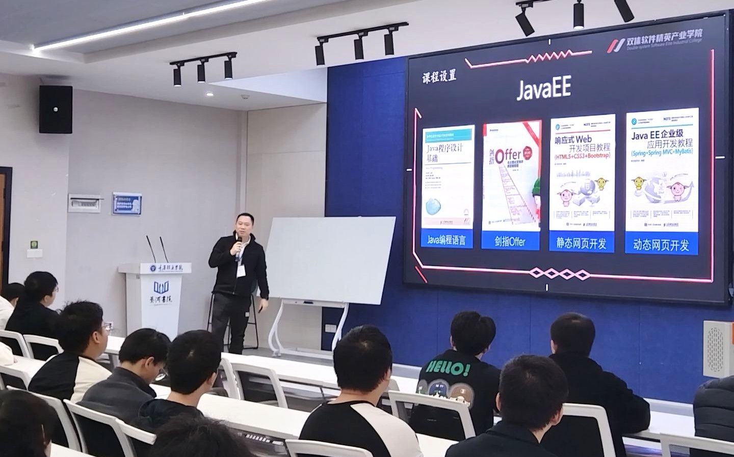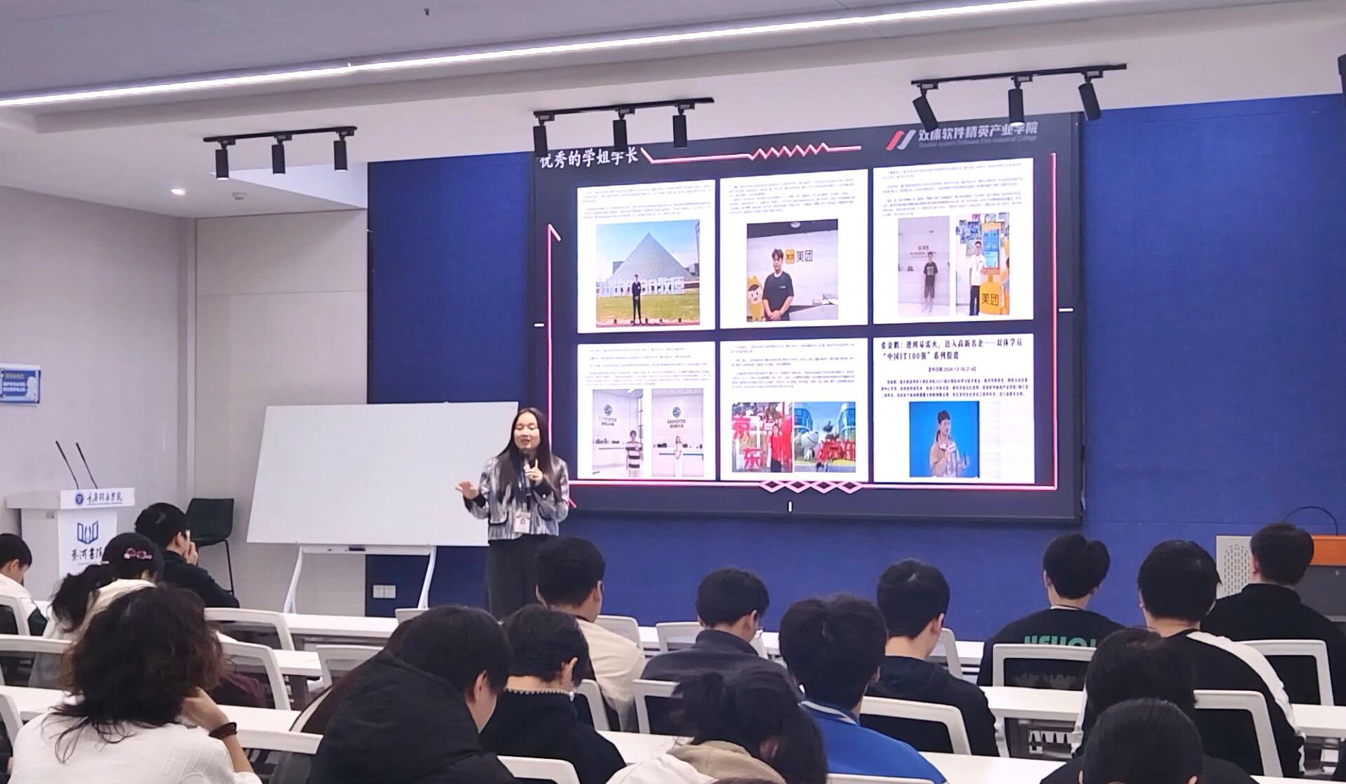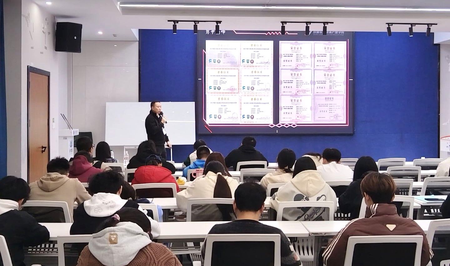 2025年11月10日,计算机学院“爬山虎计划”第三十三期活动在綦河书院·观涛多功能报告厅顺利举行。本期活动以“技术深耕,职场赋能”为主题,特邀高级职场关键能力培训师罗帮春、高级软件开发培训师杨怡担任主讲,围绕双体软件及产业学院特色、就业形势分析、简历优化与课程体系等内容展开深度分享,为计算机专业学子搭建了技术提升与职场衔接的桥梁。活动现场互动频繁,气氛热烈。