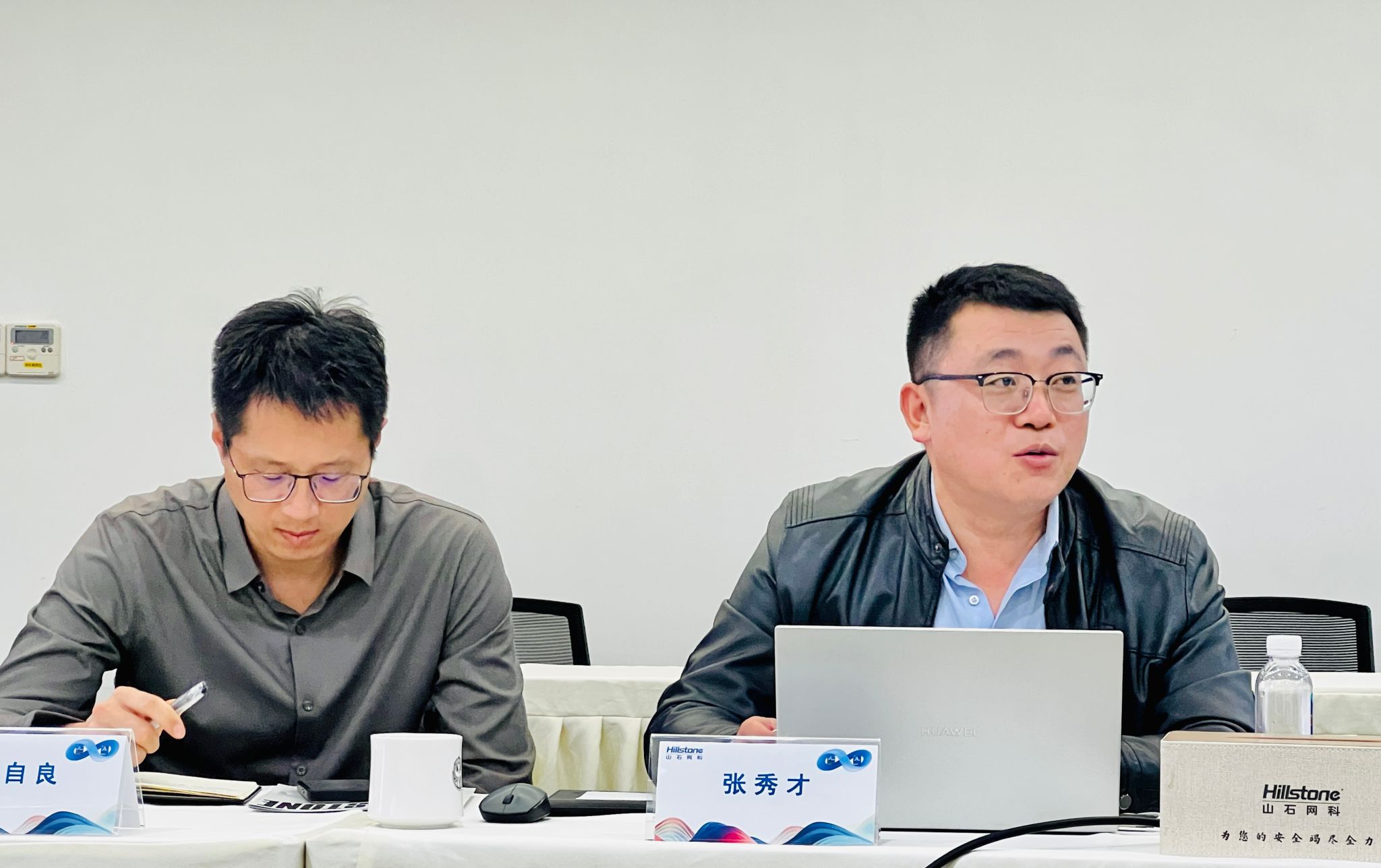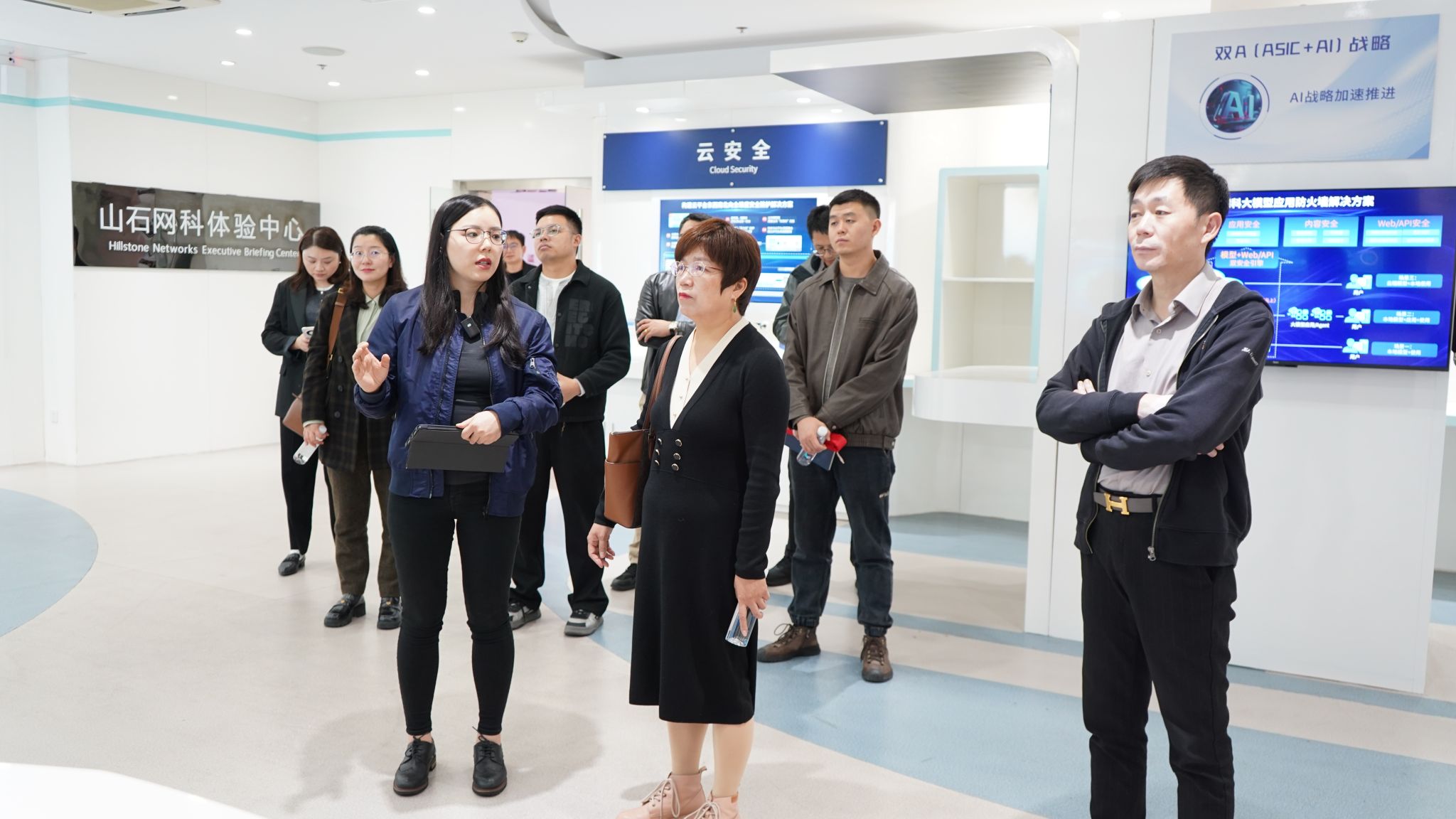 活动伊始,山石网科副总裁李校俭带领访企团队参观了企业技术展区,详细介绍了公司在边界安全、云安全、数据安全、信息技术应用创新、AI安全、安全教育等领域的核心产品研发成果、技术创新优势及行业应用场景。从前沿技术架构到实际项目落地案例,全方位展现了山石网科在网络安全领域的行业影响力与技术硬实力,让访企团队对企业的核心业务与技术发展方向有了直观且深入的了解。