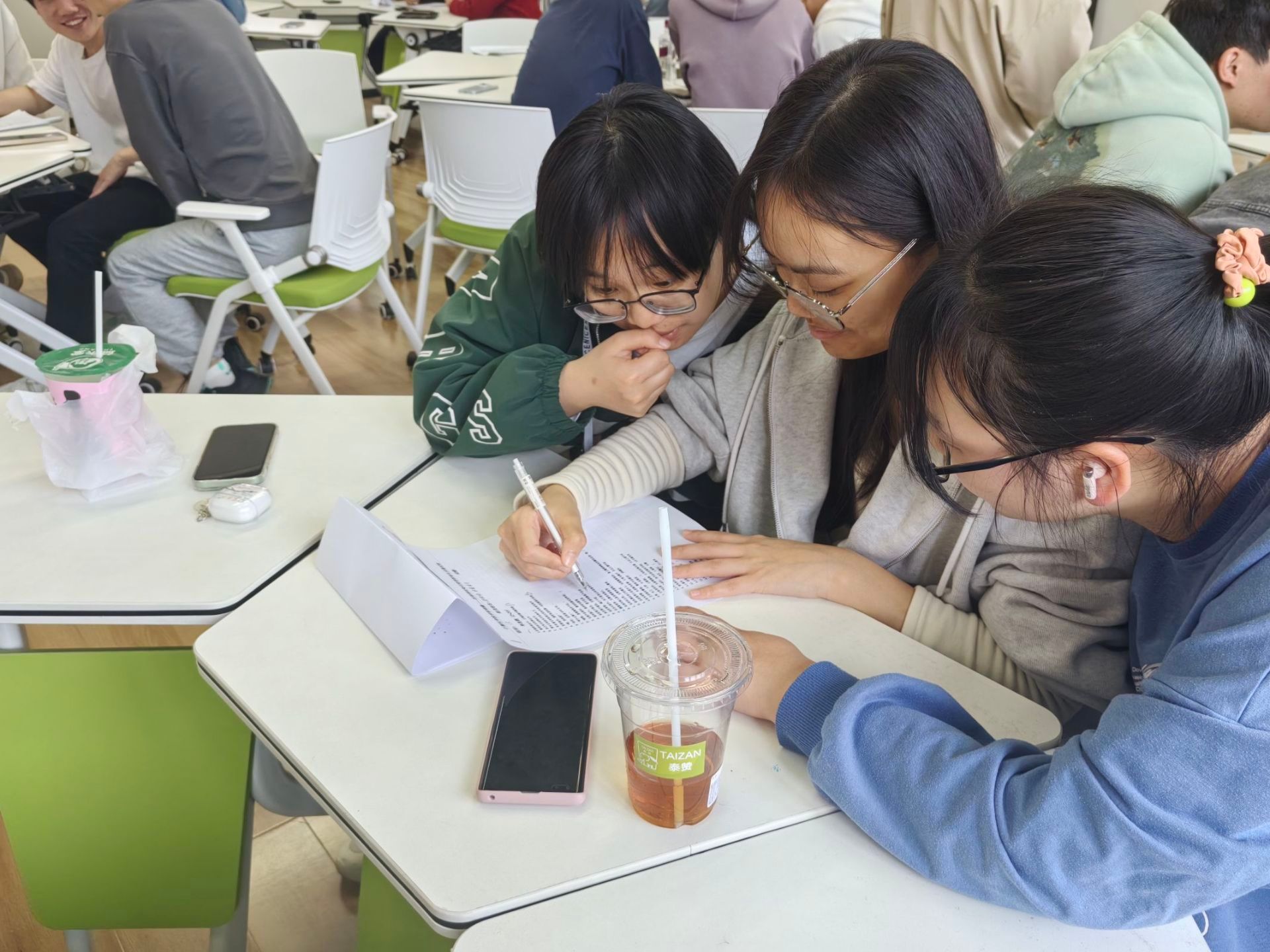 首先开始的是小组作答,三人一组进行积分赛比拼的环节。在这一环节,小组成员们相互合作,查漏补缺,共同完成一份试卷。随后各组交换批改试卷,在此过程中,同学们诚实守信、严格判分,最终决出分数最高的前四组进入第二轮。
