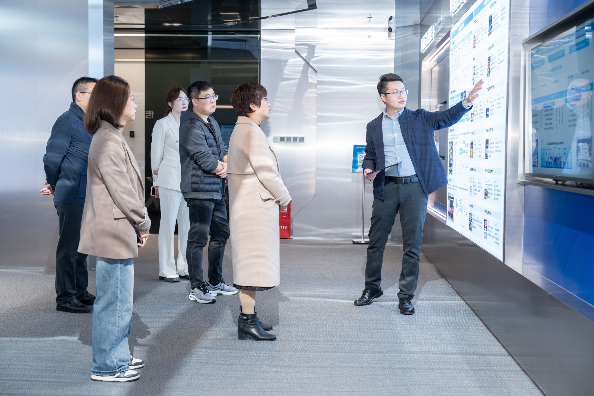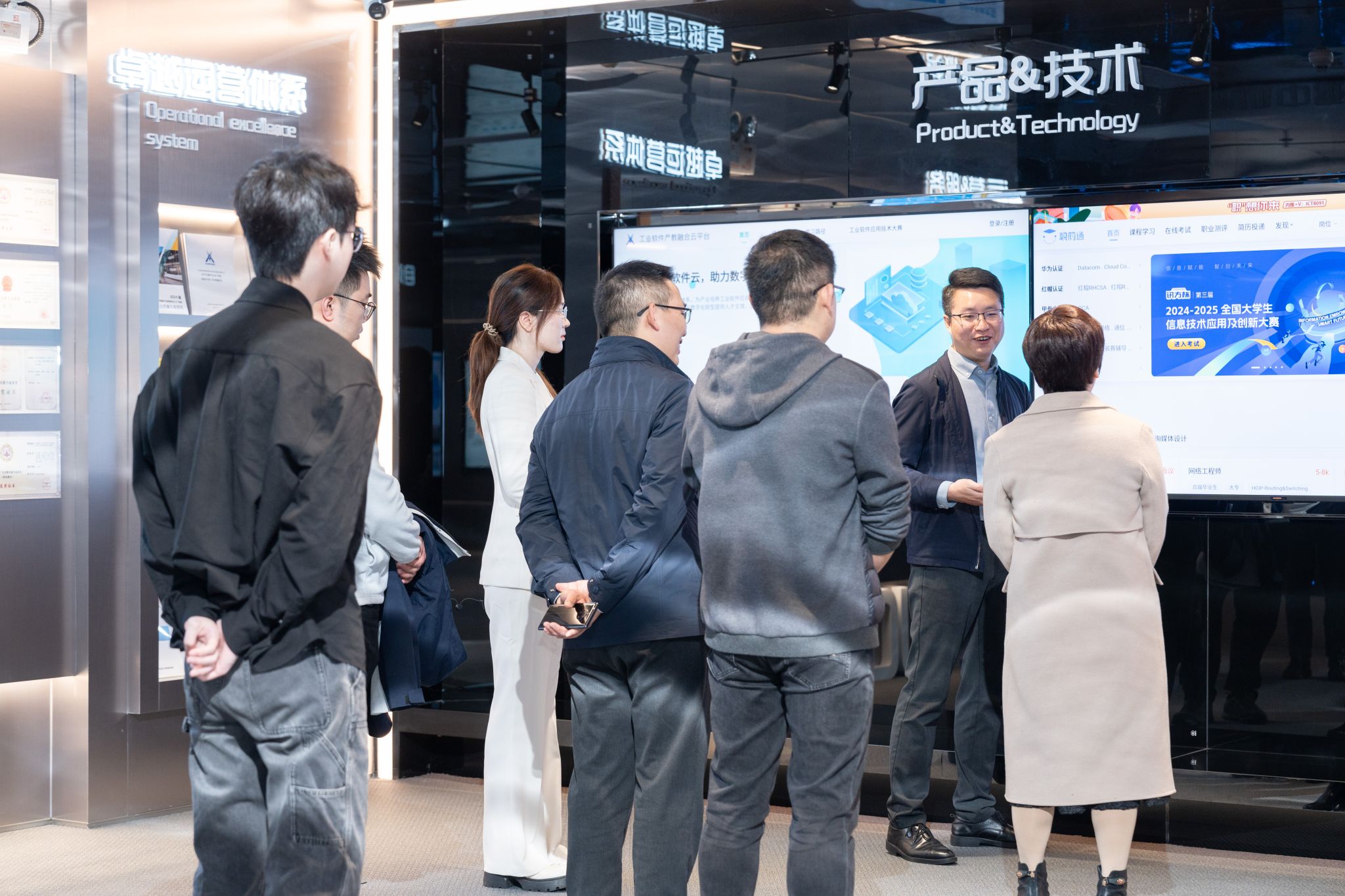 一行人首先参观了讯方技术展厅,对讯方技术的发展历程、业务模块、经营理念、合作成果等内容进行深入了解。讯方公司成立于2001年,总部位于深圳,全国26个办事处,19个智汇云校培训校区,员工4200余人,入库深圳市第一批建设培育产教融合型企业(50家),是华为多业务合作伙伴、数字化工业软件联盟人才发展组牵头单位。政企行校资源协同,与华为全面深度合作,构建“三循环”数字人才生态,致力于成为数字人才培养与输送的“黄埔军校”,为全国1000余家单位提供数字化转型服务和700余所高校提供数字人才培养服务。