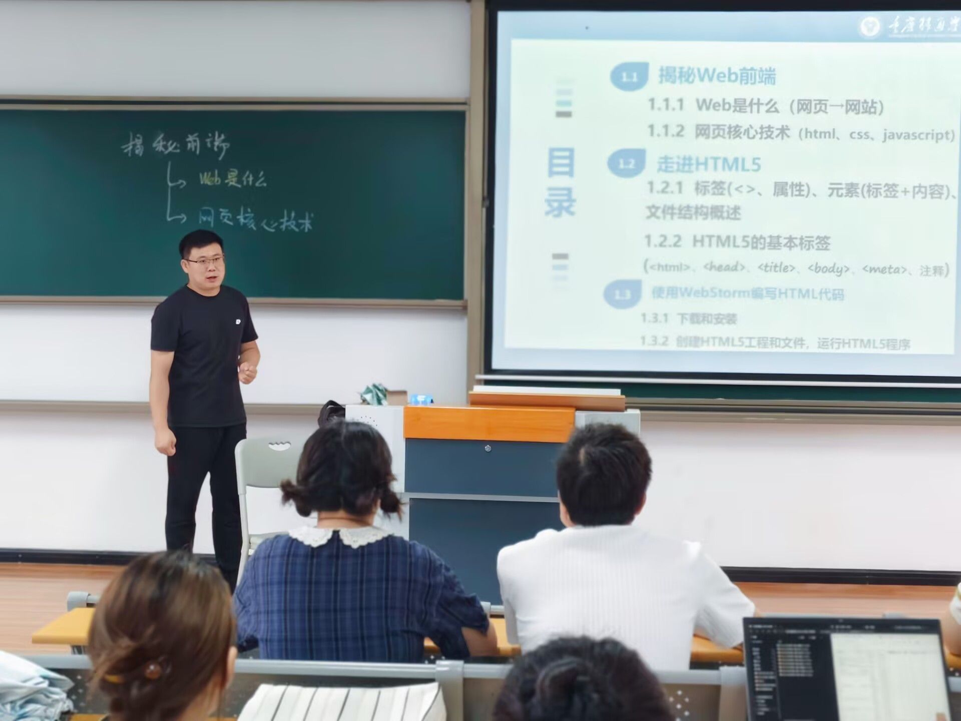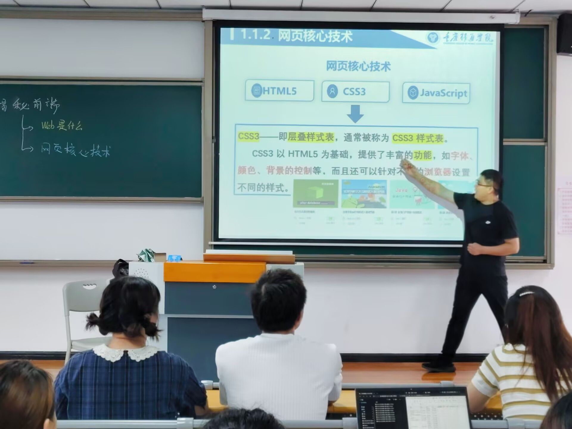 围绕“拆解网页DNA”为线索,逐层剖析前端开发的三大支柱技术。在讲解HTML5时,他通过实时编写代码演示如何用语义化标签(如<header>、<article>)构建页面结构,并指出HTML5的适应性使其成为移动端优先战略的基础语言。在解析CSS3环节,卢老师以“重庆移通学院官网导航栏”为例,现场调整CSS属性实现“一码适配PC与移动端”的响应式效果。他笑称,CSS3是前端工程师的“魔法棒”,能让文字跳舞、图片变形。而在探讨JavaScript时,卢老师通过编写按钮点击事件与表单验证代码,将静态页面转化为动态交互界面。他强调,JavaScript的魅力在于“所见即所控”,是前端工程化的核心驱动力。
