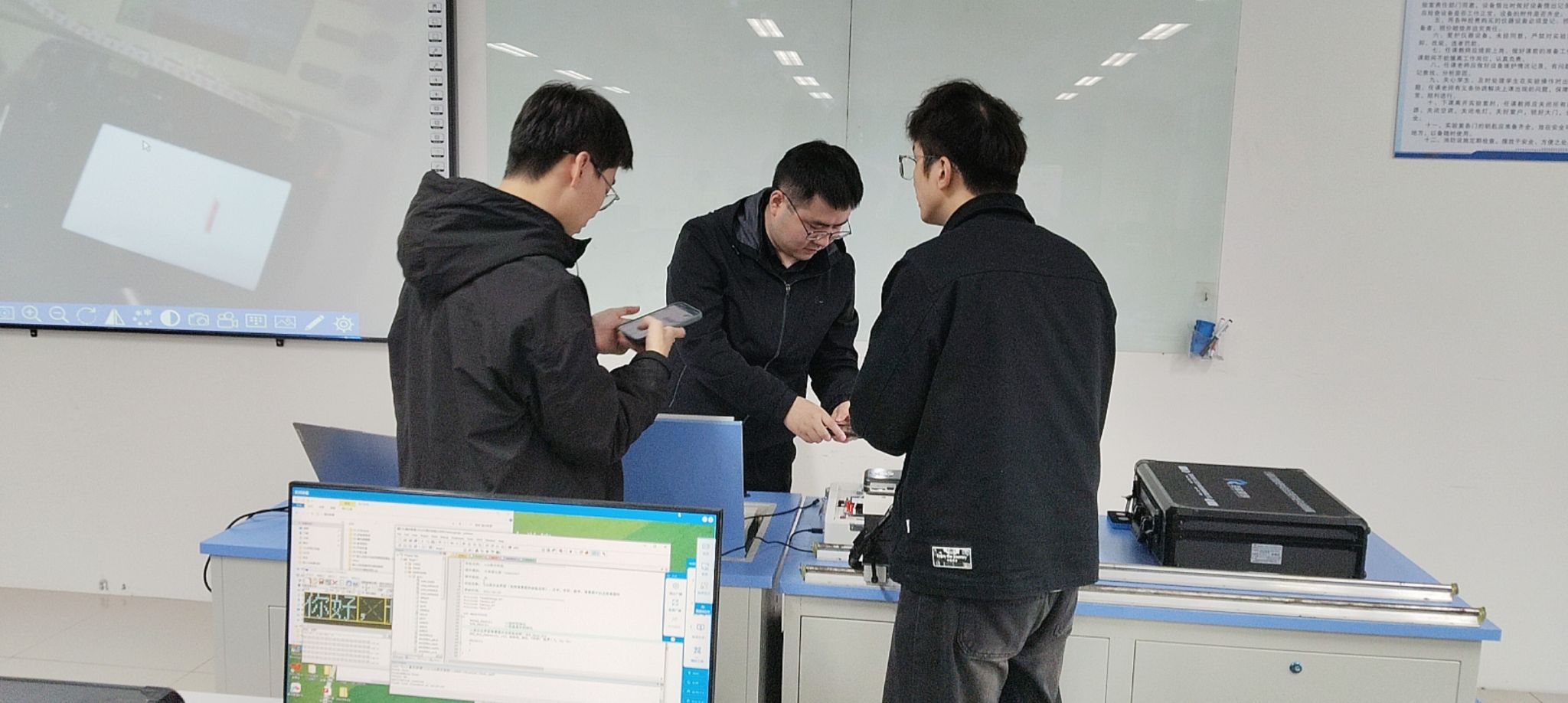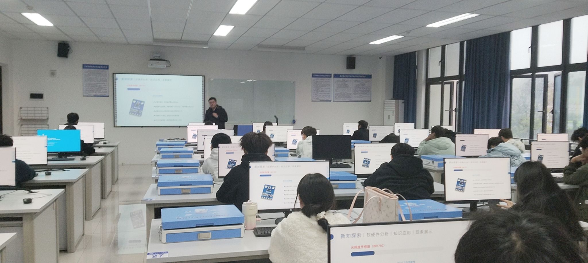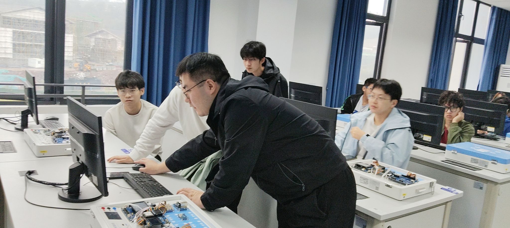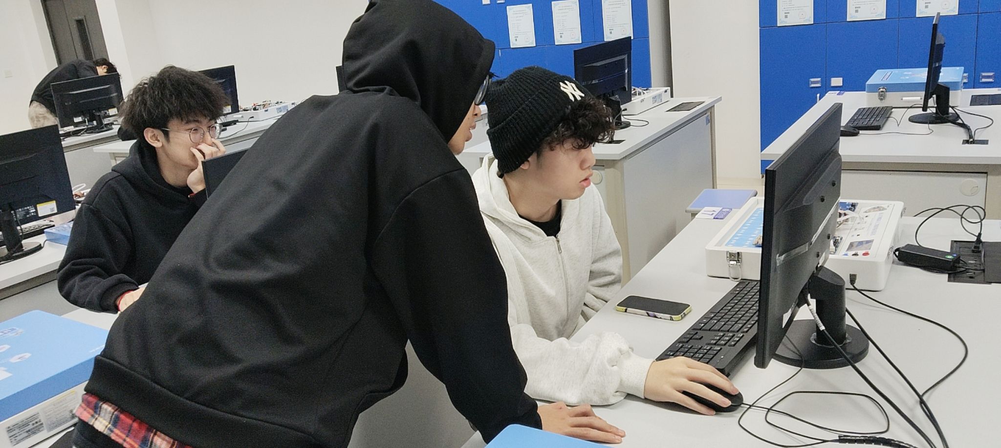 本次培训采用“企业专家+学院教师”双师模式。百科荣创的工程师专家带领学生分组操作基于STM32F4芯片的嵌入式系统,从硬件连接到代码调试全程指导。学院教师则辅助解决问题,确保每位学生都能跟上进度。在实验项目中,学生需团队协作完成目标,机房内此起彼伏的讨论声和成功提示音交织成生动的实践图景。