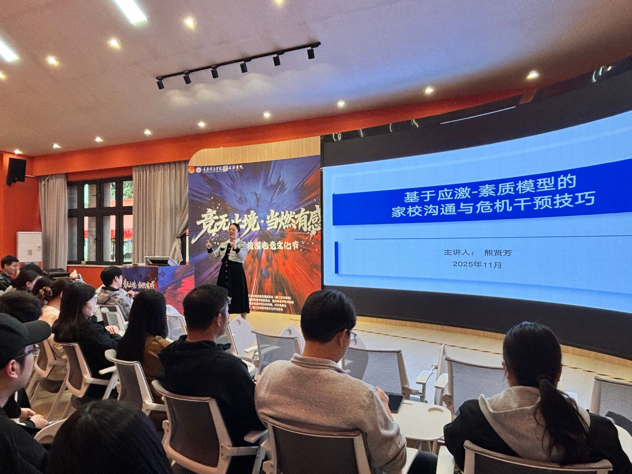 为进一步提升学院教职工家校沟通能力,强化学生危机干预工作水平,切实筑牢学生成长安全防线,2025 年 11 月 5 日上午 9 点,计算机学院在古剑书院含光报告厅成功举办《基于应激 - 素质模型的家校沟通与危机干预技巧》专题讲座。本次讲座特别邀请重庆邮电大学自动化学院工会主席熊贤芳担任主讲嘉宾,学院全体教职工参加了此次培训。