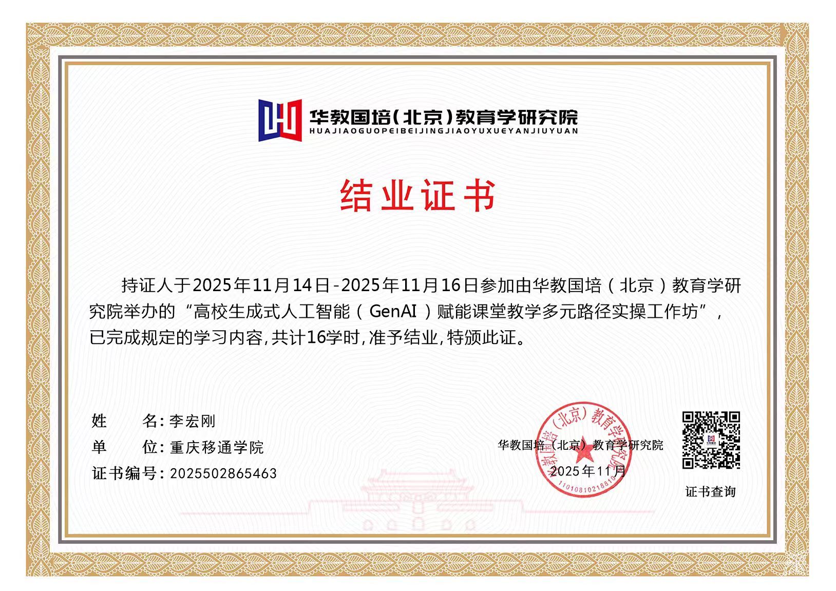 为积极响应国家教育数字化战略行动,深化人工智能技术与教育教学的深度融合,提升本科课程建设质量与教学创新能力,2025 年 11 月 14 日 - 17 日,由华教国培 (北京) 教育学研究院主办的 "高校生成式人工智能 (GenAI) 赋能课堂教学多元路径实操工作坊" 在北京成功举办。计算机学院智能科学教研室李宏刚老师受邀参加此次专项培训,与来自全国各高校的一线教师、教学管理人员等同行共同探索智能时代教学创新的实践路径。