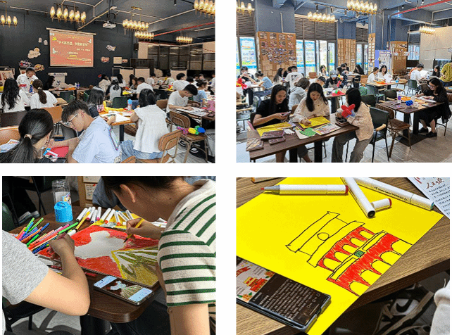 随着出席嘉宾介绍完毕,张子轩同学就本次活动的流程做了简单说明,待所有参与者表示无疑后,宣布今天的活动正式开始。同学们纷纷离开座位,根据自己活动前分配的组队,有序地领取了各自所需的DIY道具,随即投入到各自团队的DIY作品创作中。活动现场洋溢着轻松愉悦的氛围,画笔在纸上轻盈地舞动,发出沙沙的声响,与同学们间轻松的交谈声交织成一首和谐的乐章。每个人都全神贯注于自己的创作,脸上的笑容透露出对DIY制作的热爱与享受。各组作品各具特色,无论是创意还是技巧,都展现出了同学们的独特风采。注重细节或是追求个性、创意贴图或是大胆绘色,无疑为活动现场增添了一道道亮丽的风景线,吸引了评委老师的目光。