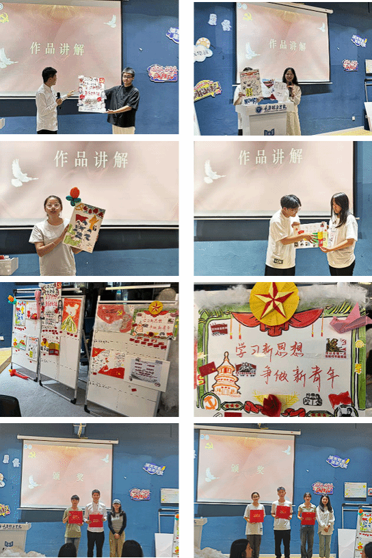 在经过长达40分钟的团队制作,各种别出心裁的作品纷纷亮相,令人眼前一亮。紧接着,各组按照既定顺序,派出代表上台展示各自的作品,并详细阐述其创作思路以及独特的见解。待每组展示完毕,展览板上的作品逐渐被粘贴起来。评委老师观看各小组的制作后,相互讨论着想法。随后,根据自己的喜好和评判标准,拿起桌子上提前准备好的贴纸,就心仪的作品,拿上提前放置在桌子上的贴纸,对各小组的海报、手卡进行投票。